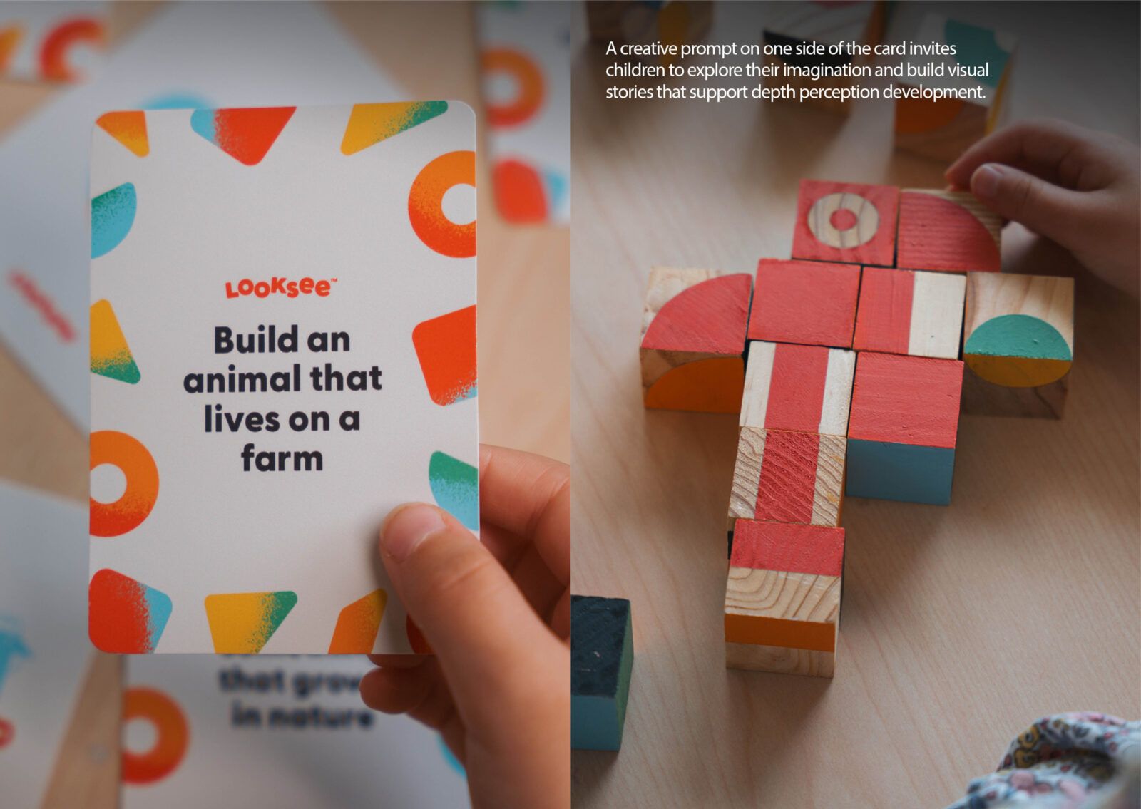 By replacing patching with red/blue anaglyph glasses, Looksee subtly targets monocular eye use. Illustrated prompt cards reveal hidden images, encouraging narrative building and spatial play using patterned blocks. Each component is carefully aligned with clinical exercises, while remaining non-prescriptive and accessible. The storytelling dimension is central: characters and prompts are used to develop visual narratives, engaging children emotionally and cognitively, thereby reinforcing the therapeutic outcomes. The strength of the idea lies in its alignment with behavioural change through joyful experience, blending clinical function with emotional design. It is an innovative reframing of a healthcare intervention through imaginative design.