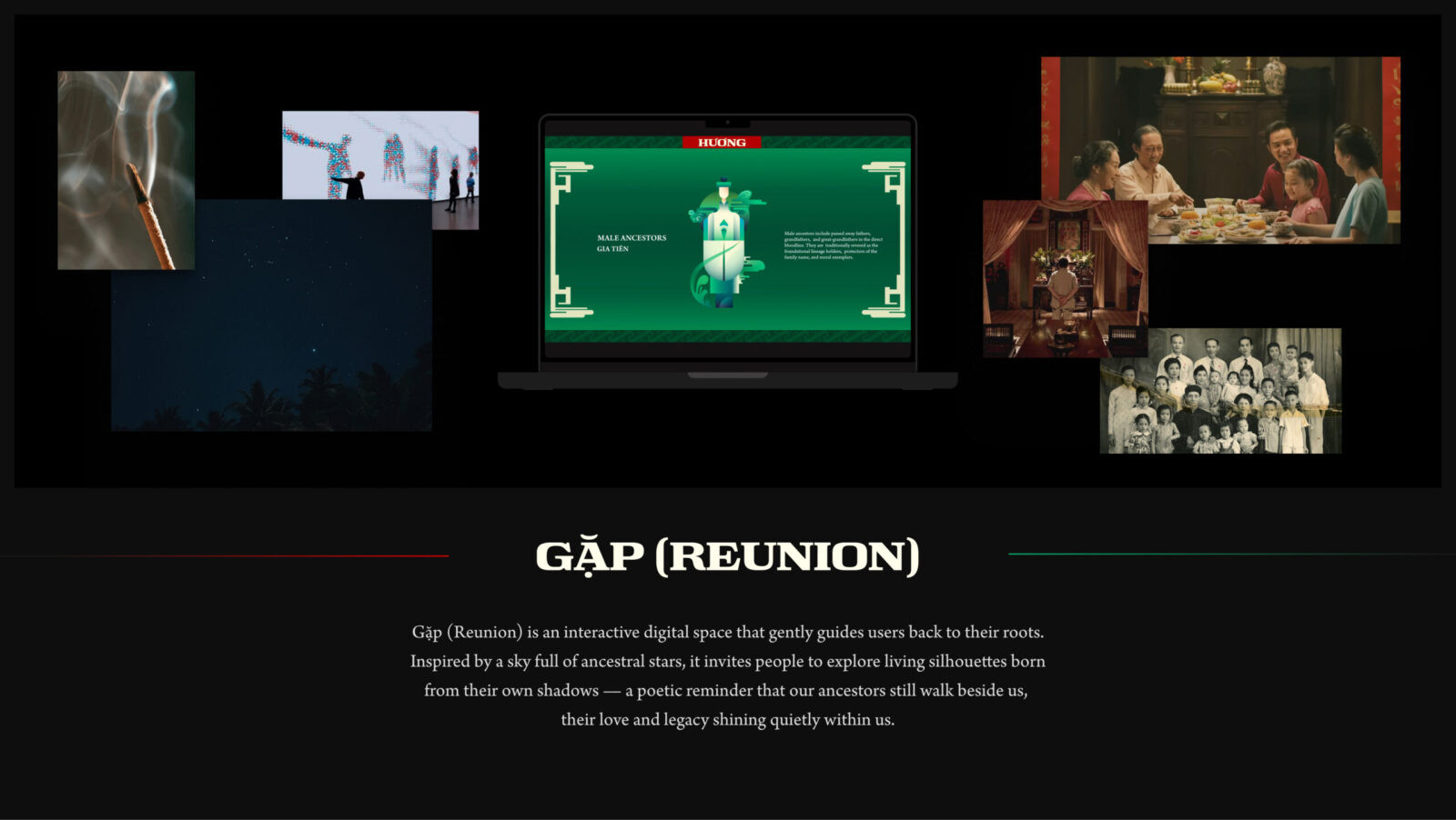 Purpose & Function: Gặp (Reunion) was created as a profoundly interactive experiential space, a digital bridge bringing users back to their sacred roots. Going beyond merely introducing the cultural figures on the packaging, it allows users to “interact” and “explore” silhouettes – symbolic shadows of their own ancestors and passed-away loved ones. Through this, the website helps them deeply feel that their roots are ever-present and that their ancestors are always by their side.