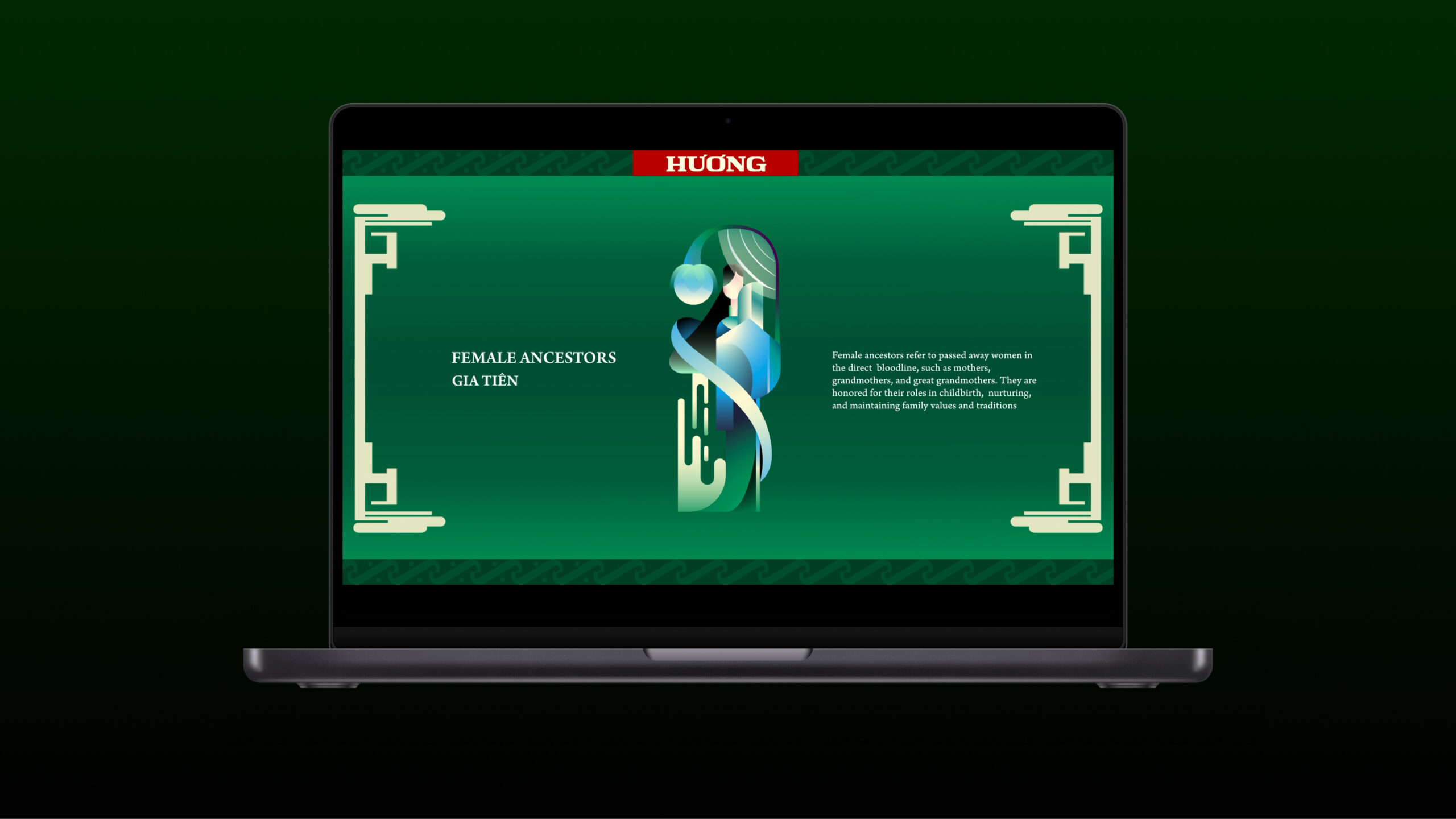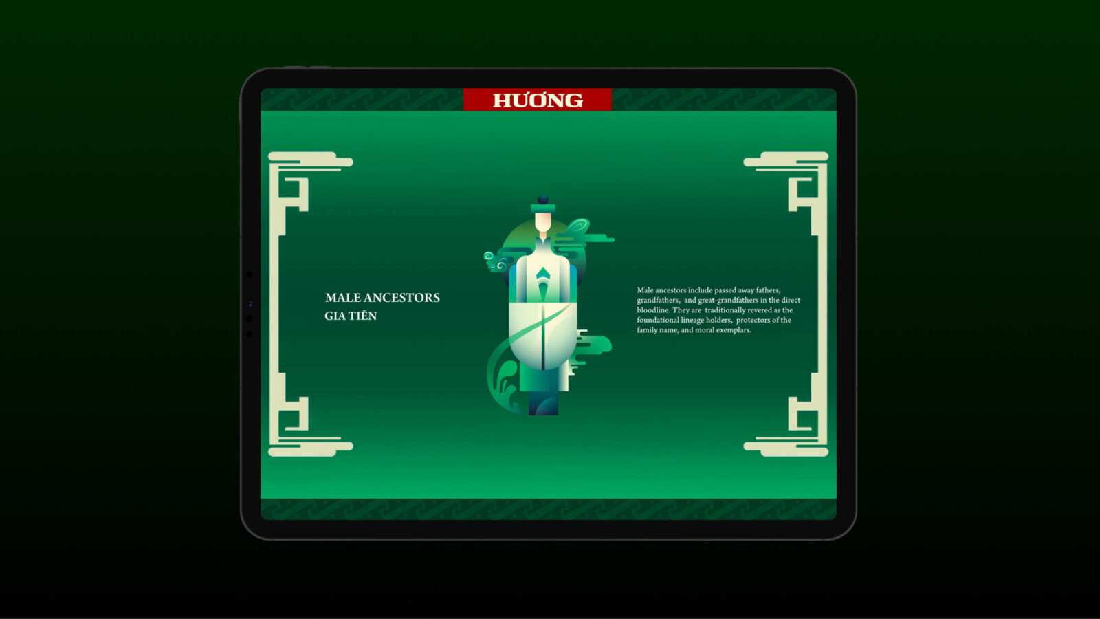 Palette: The color palette focus on two tones: Red and Green, across various shades. The product of “Hương” primarily uses red (Fire) to symbolize luck, vitality, life force, and prosperous power, combined with green (Wood) to symbolize trees, nature, vitality, and vigorous growth. This creates a design rich in Feng Shui symbolism within East Asian folklore, reflecting the concept of the Five Elements (metal, wood, water, fire, earth) that make the universe. In terms of tone, before pastel shades appeared, Eastern traditional art favored bold, strong hues, so the “Hương” product is designed to mirror that same color usage.