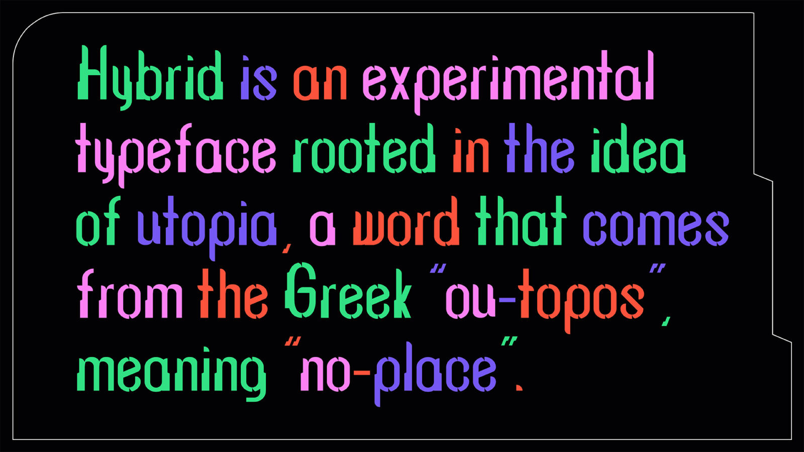 Hybrid is an experimental typeface rooted in the idea of utopia — a word that comes from the Greek ou-topos, meaning “no-place.” Thomas More coined the term in the 16th century to describe an ideal society that, by definition, does not exist and perhaps never will. Over time, many thinkers have reinterpreted utopia not just as a perfect world, but as a way to imagine new possibilities for the future. With this in mind, Hybrid was born from exploring different visions of utopia, bringing together visual form, philosophy, and technological speculation.