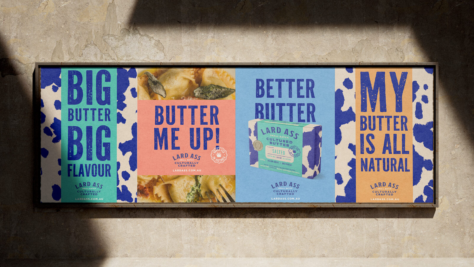 The new brand identity now reflects Lard Ass Butter’s innovative nature. Studio Guild created a series of assets communicating the flavours and food matchings as well as highlighting the key selling points of “grass fed” and “no preservatives”. The distinctive cow hide makes an impression no matter what the application. It alone has become a visual asset that is now recognised even without their cheeky name.