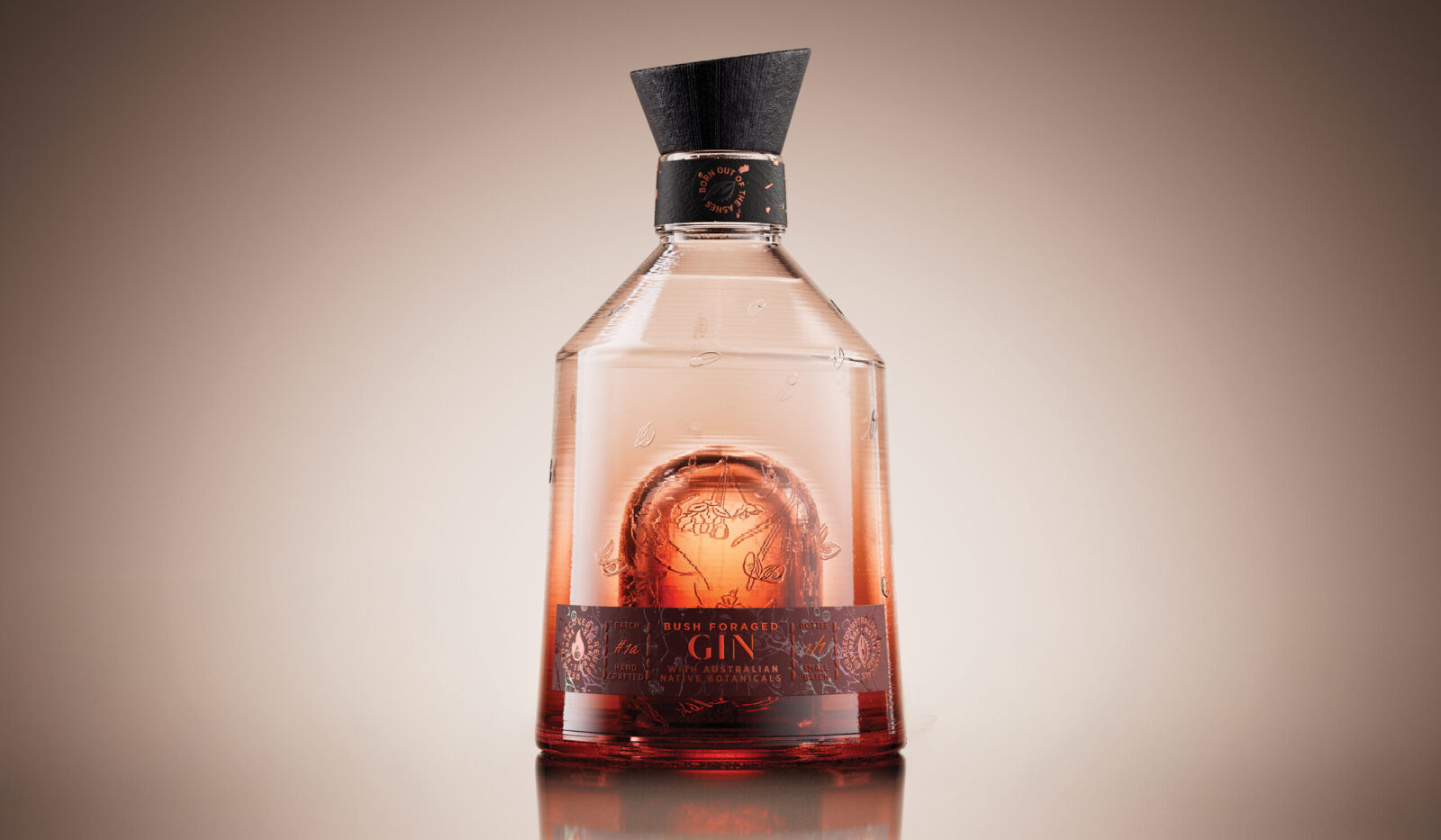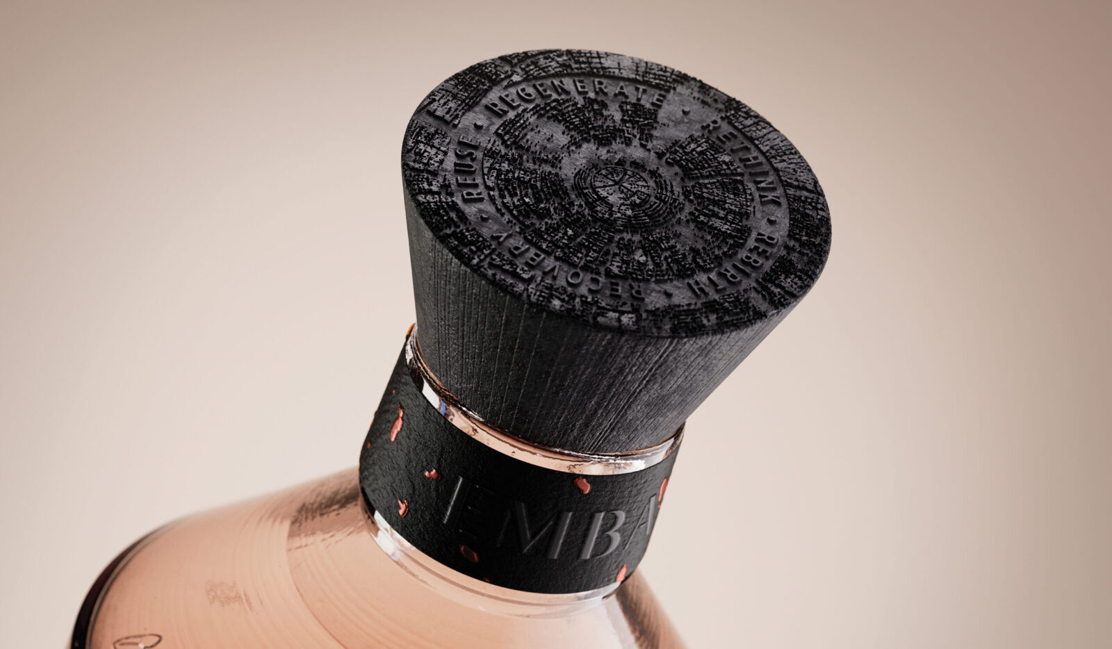 The charred wood closure holds the brand’s message, also etched into the bottle’s base: recovery, reuse, regenerate, rethink, rebirth. A mantra of renewal whispered through every detail.
