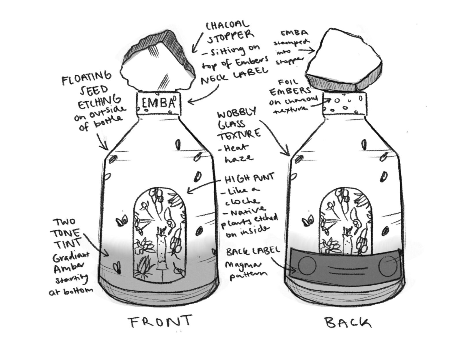 Named EMBA, drawn from the word ’ember’, the brand is a quiet spark that speaks of fire, transformation, and revival. Around the neck, the label is debossed with the scorched texture of charred wood, with flickering glowing, foil embers.