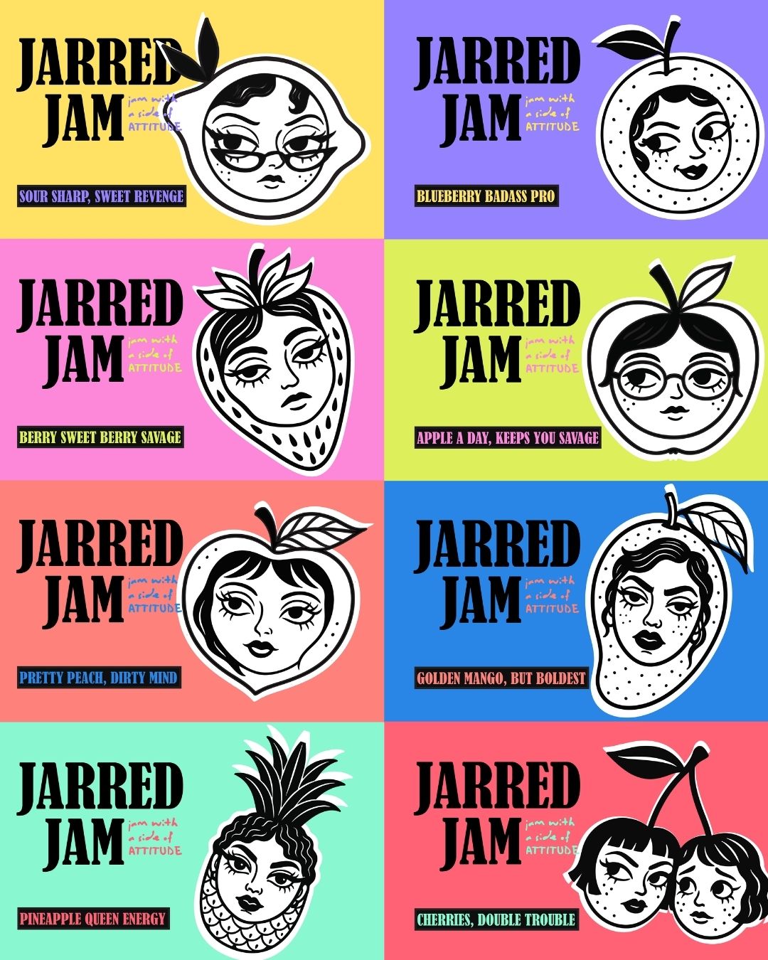 Every illustration carries the same chaotic, delicious energy as the moment when jam hits hot toast and melts into pure fruity madness. There are no soft strawberries or polite peaches—just straight-up flavour with fire. Jarred doesn’t whisper “sweet”; it shouts, growls, and slaps personality onto every slice of bread like it’s a canvas for chaos.