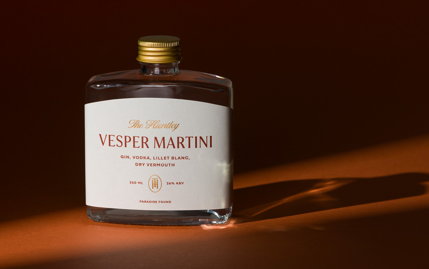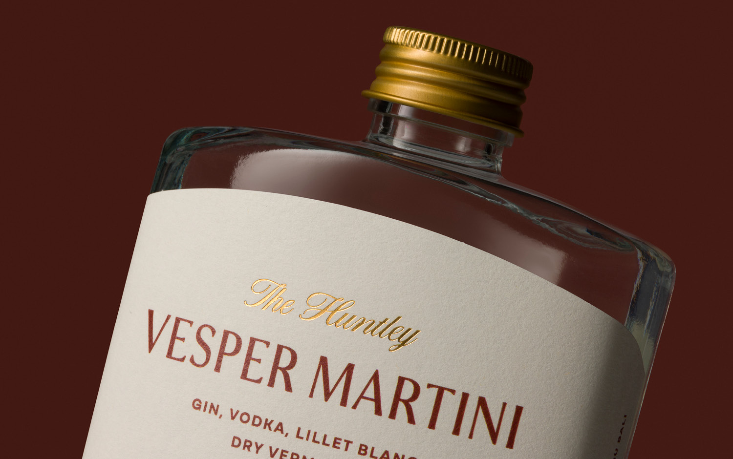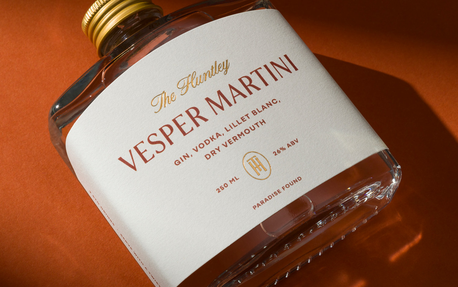 The Huntley signature bottled cocktail design invites hotel guests to experience a moment of Palm Springs nostalgia from the luxury of their private villa. This bespoke mini bar collection includes a series of old-school aperitifs inspired by the suave charm of the 1950s golden era. This theme is carried throughout, from the vintage Vesper Martini recipe, to the style of the glass bottle that contains it. A classic hip flask shape silhouette is paired with premium print finishes and gold accents to deliver a design that is both evocative and elevated.