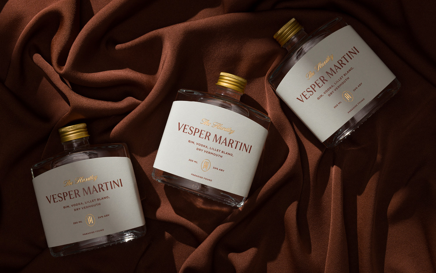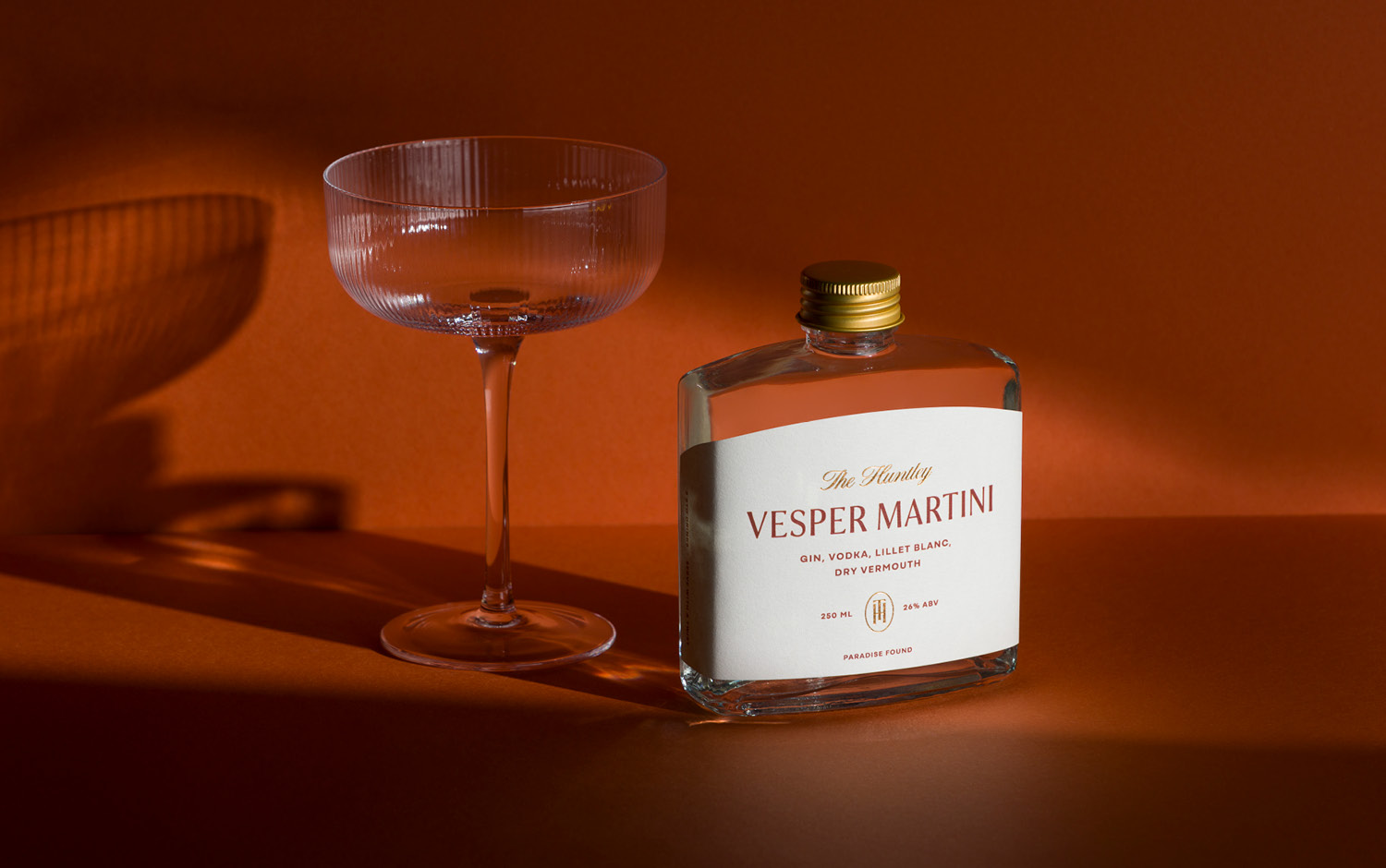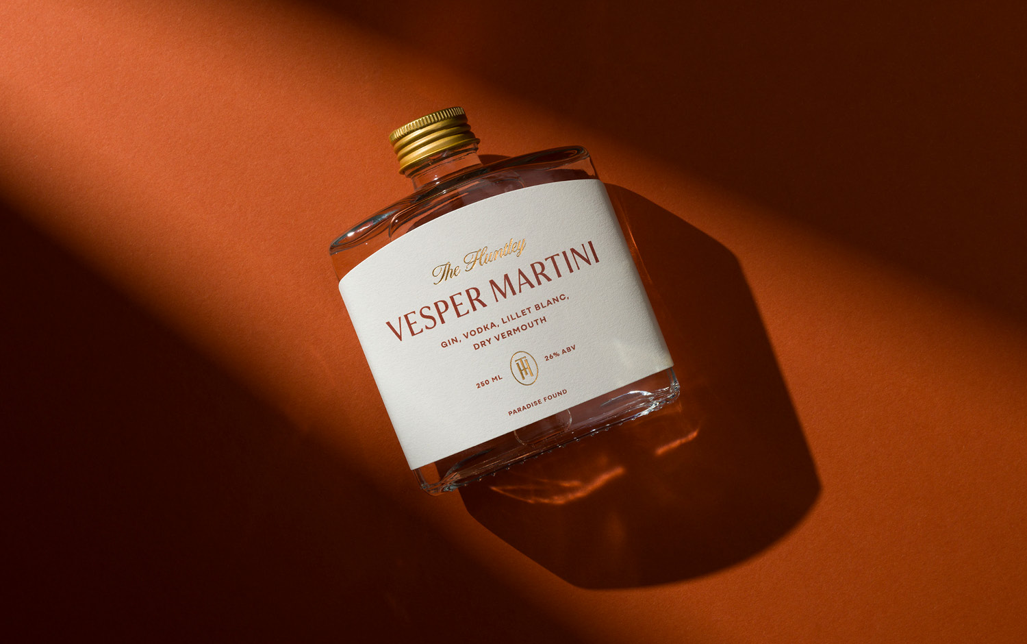 The Huntley signature bottled cocktail design invites hotel guests to experience a moment of Palm Springs nostalgia from the luxury of their private villa. This bespoke mini bar collection includes a series of old-school aperitifs inspired by the suave charm of the 1950s golden era. This theme is carried throughout, from the vintage Vesper Martini recipe, to the style of the glass bottle that contains it. A classic hip flask shape silhouette is paired with premium print finishes and gold accents to deliver a design that is both evocative and elevated.