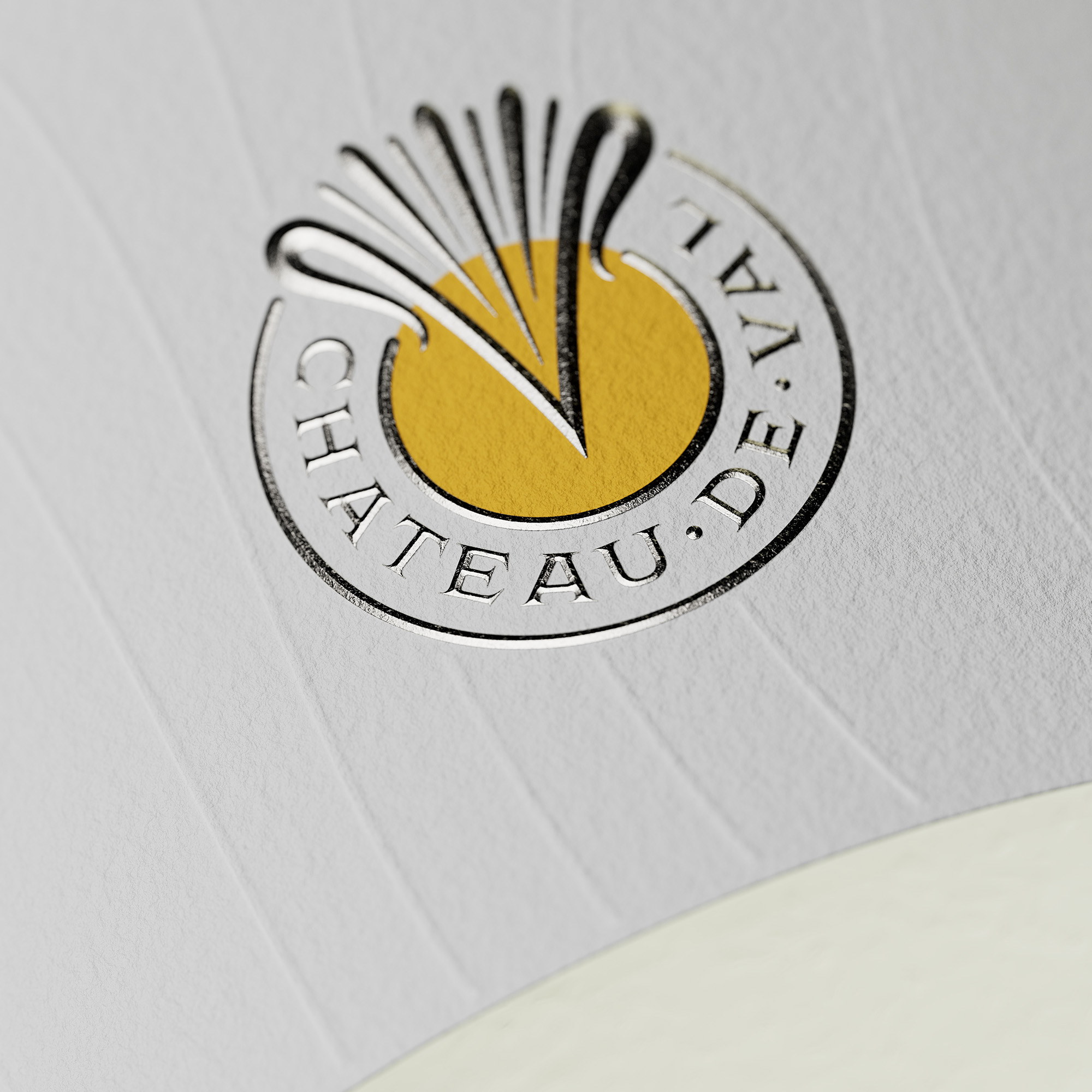 The emblem of Château De Val sits at the base of the label a circular V-shaped mark with a golden sunburst accent, symbolizing warmth, optimism, and craftsmanship.