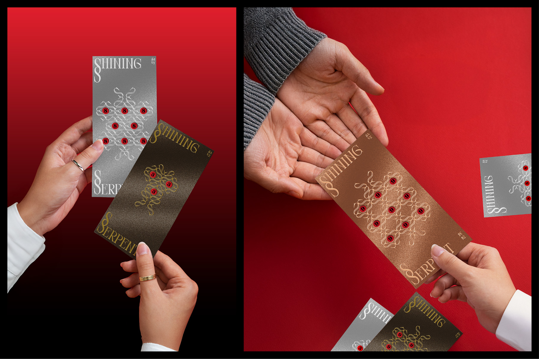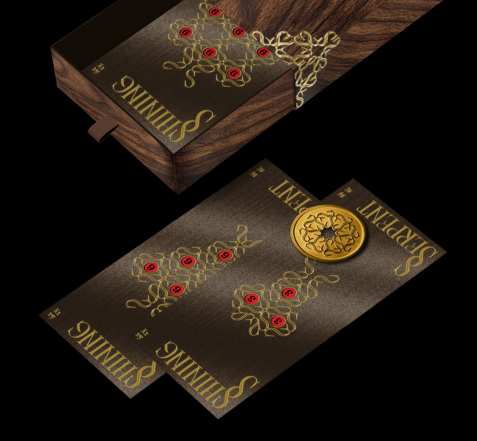 During the development of the packaging we were particularly inspired by the tradition of Chinese coin strings. In ancient culture coins were often tied together with red cords, forming a chain that symbolized wealth, prosperity, and the continuous flow of fortune. The belief was that when coins were connected together, money would circulate, accumulate, and grow over time. This idea felt conceptually close to the image of a serpent, which coils around itself and sheds its skin in order to grow stronger.