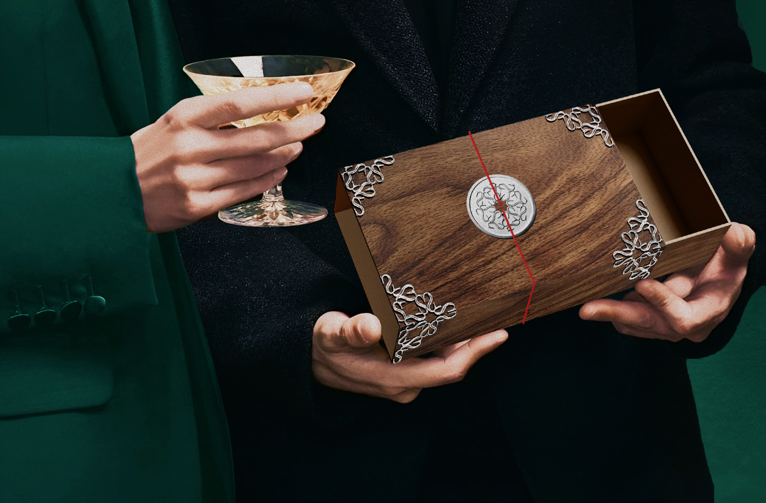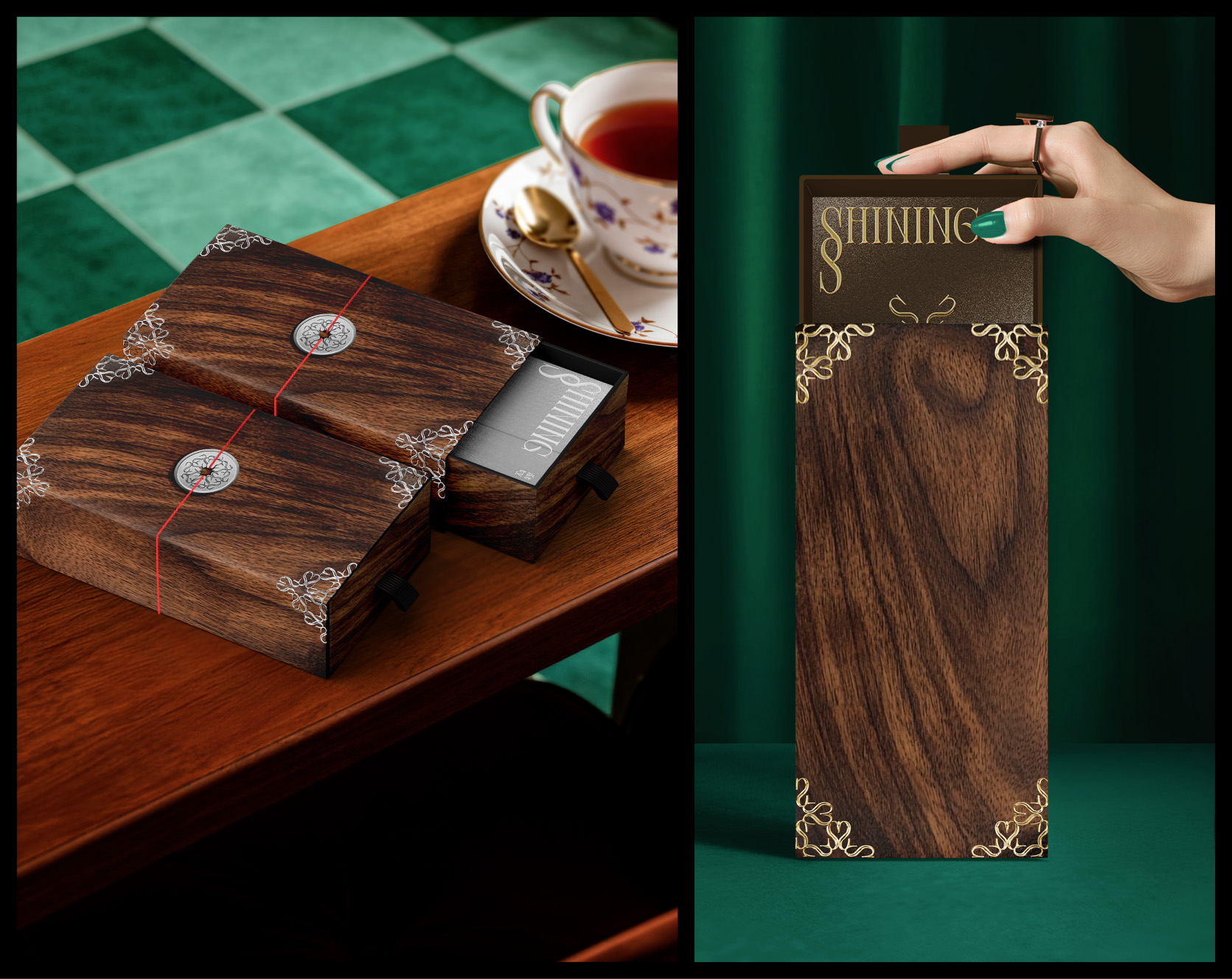 The wooden boxes are constructed with metallic plated edges finished in copper, silver, and gold tones. The wooden body communicates warmth, craftsmanship, and durability, while the metal edges serve both as protective frames and as visual highlights. The metallic finish adds a sense of refinement and elegance, transforming the objects from simple packaging into a series of much more ceremonial and collectible artifacts.
