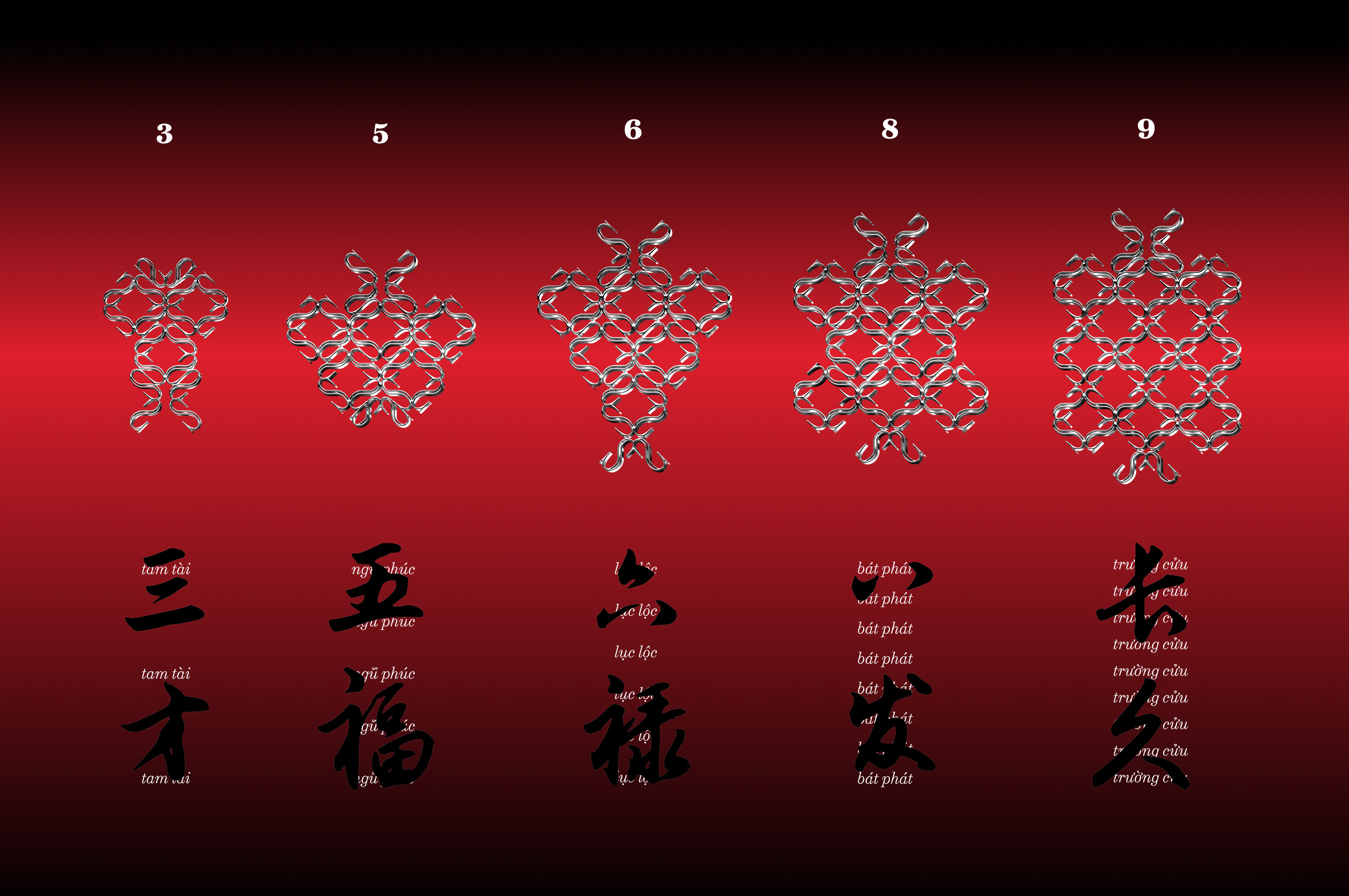 The number of coins tied together also represents different symbolic meanings and blessings. Three coins represent Tam tài (三才), the three fundamental elements of the universe, Thiên (天), Địa (地), Nhân (人). These three forces must exist in harmony for life and growth to flourish. Five coins represent Ngũ phúc (五福), the five blessings which include Trường thọ (長壽), Phú quý (富貴), Khang ninh (康寧), Hảo đức (好德), Thiện chung (善終). Six coins represent Lộc (禄), symbolizing financial fortune and material prosperity. Eight coins represent Phát (發), meaning prosperity, growth, and success. Nine coins represent Trường cửu (長久), symbolizing longevity, stability, and lasting continuity.