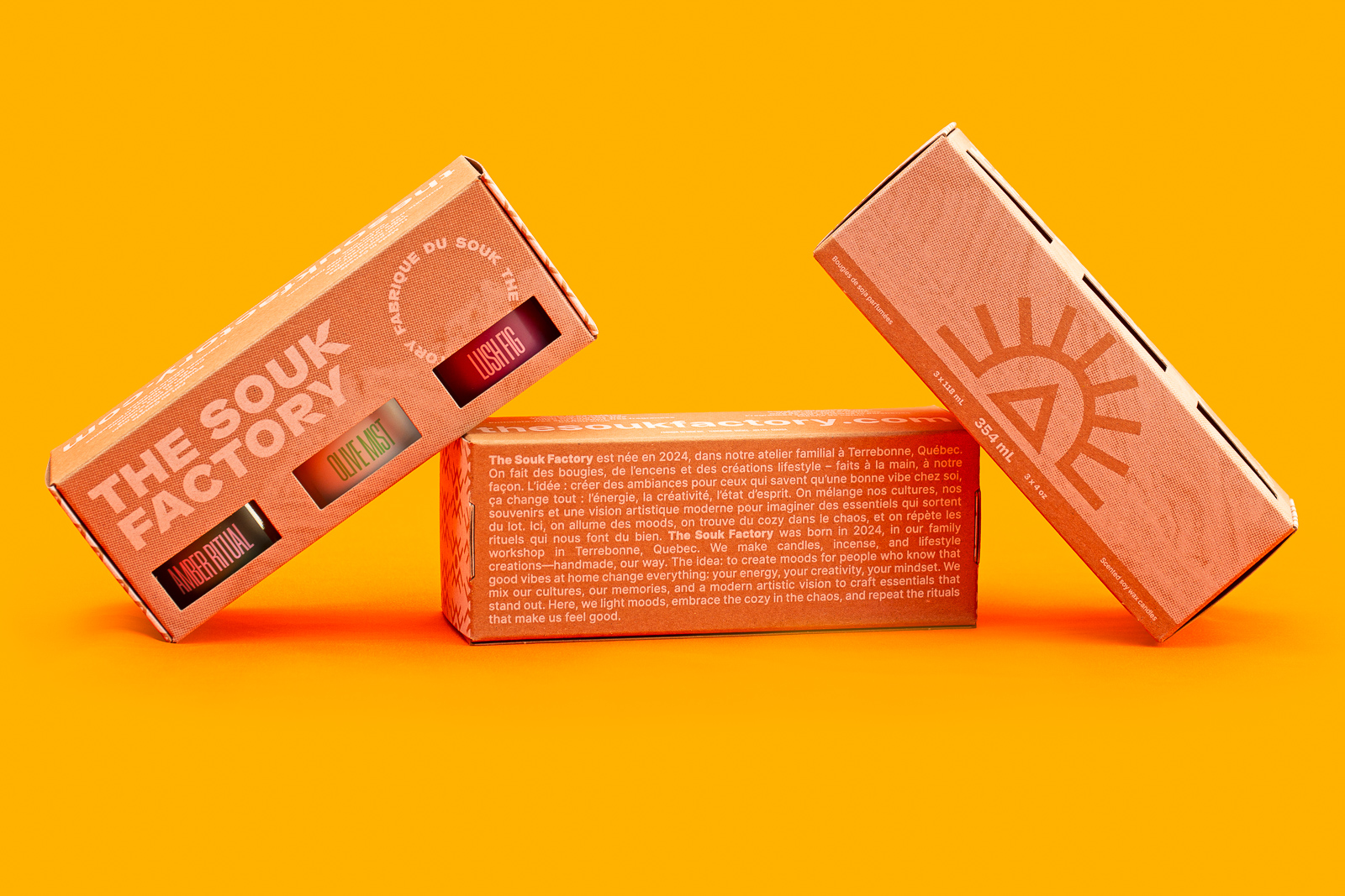 The Souk Factory’s visual world grows out of a meeting of cultures and perspectives shaped by the stories and experiences of its co-founders, Myriam and Najim. The references they shared Moroccan graphic traditions, souk aesthetics, rich colours, and tactile materials reflected a blend of influences informed in part by Najim’s Moroccan and Amazigh heritage. This contrast and complementarity guided the creative direction, leading to a more vibrant and expressive identity that felt true to the brand’s spirit.