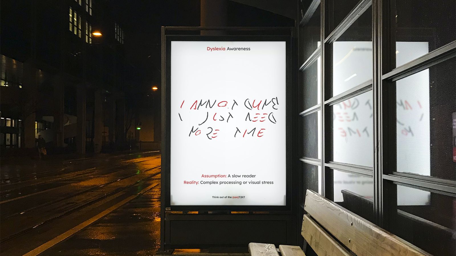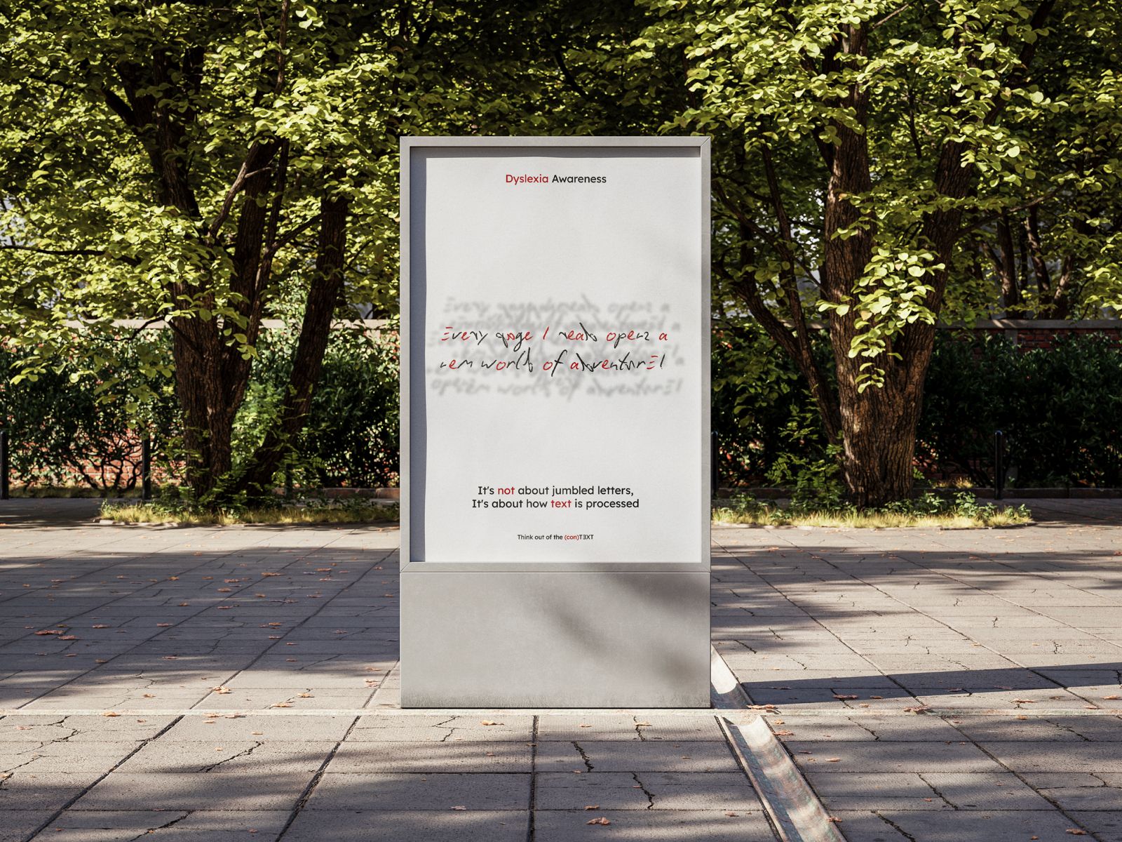 Through a cross-media campaign addressing six core myths—ranging from the misconception that dyslexia is a simple language barrier to the false belief that it affects analytical reasoning—the project demonstrates the scalability of a unified visual identity. The effectiveness of this approach is backed by rigorous user testing; preliminary results showed a significant shift in participant understanding, moving from a 46% baseline to 90% post-exposure. By bridging the gap between clinical reality and public perception, Think out of the (con)TEXT establishes communication design as a vital tool for neurodiversity advocacy, transforming misconceptions into meaningful moments of empathy and education.