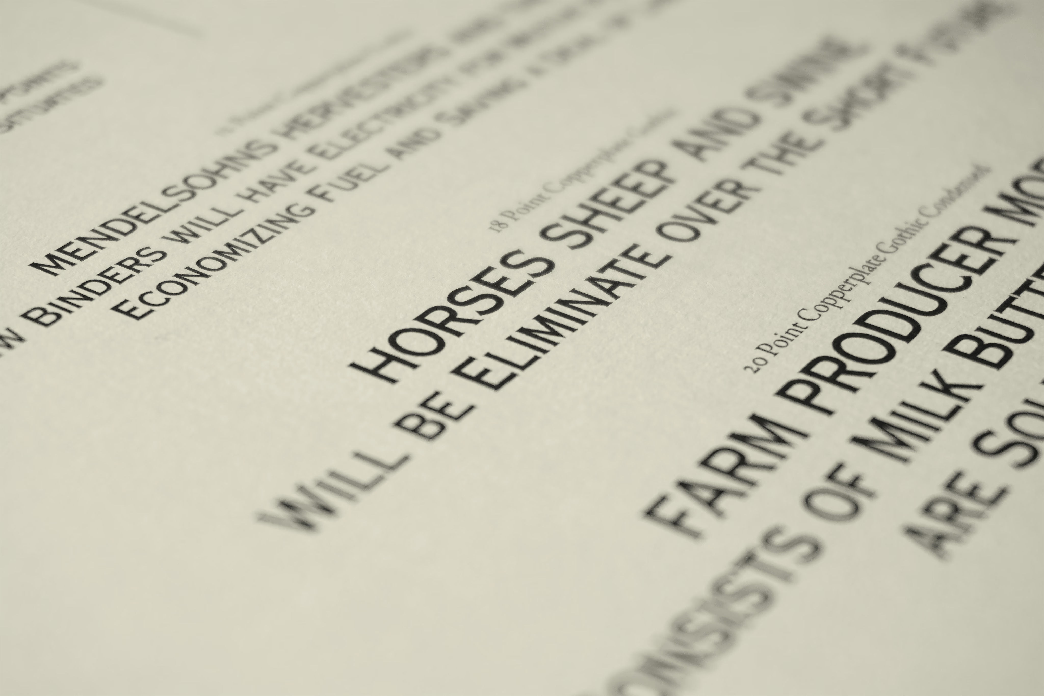 Research into the ATF archives and vintage newspapers informed the layout. The visual language mimics the print media of the 1900s, utilizing a symmetrical, column-based structure, drop caps, and specific typographic quirks – such as slightly embossed capital letters – to simulate the physical “bite” of metal type into paper. To complement the sharp, industrial serifs of Copperplate Gothic, Garamond was selected for the body text, providing a refined and classic historical context.
