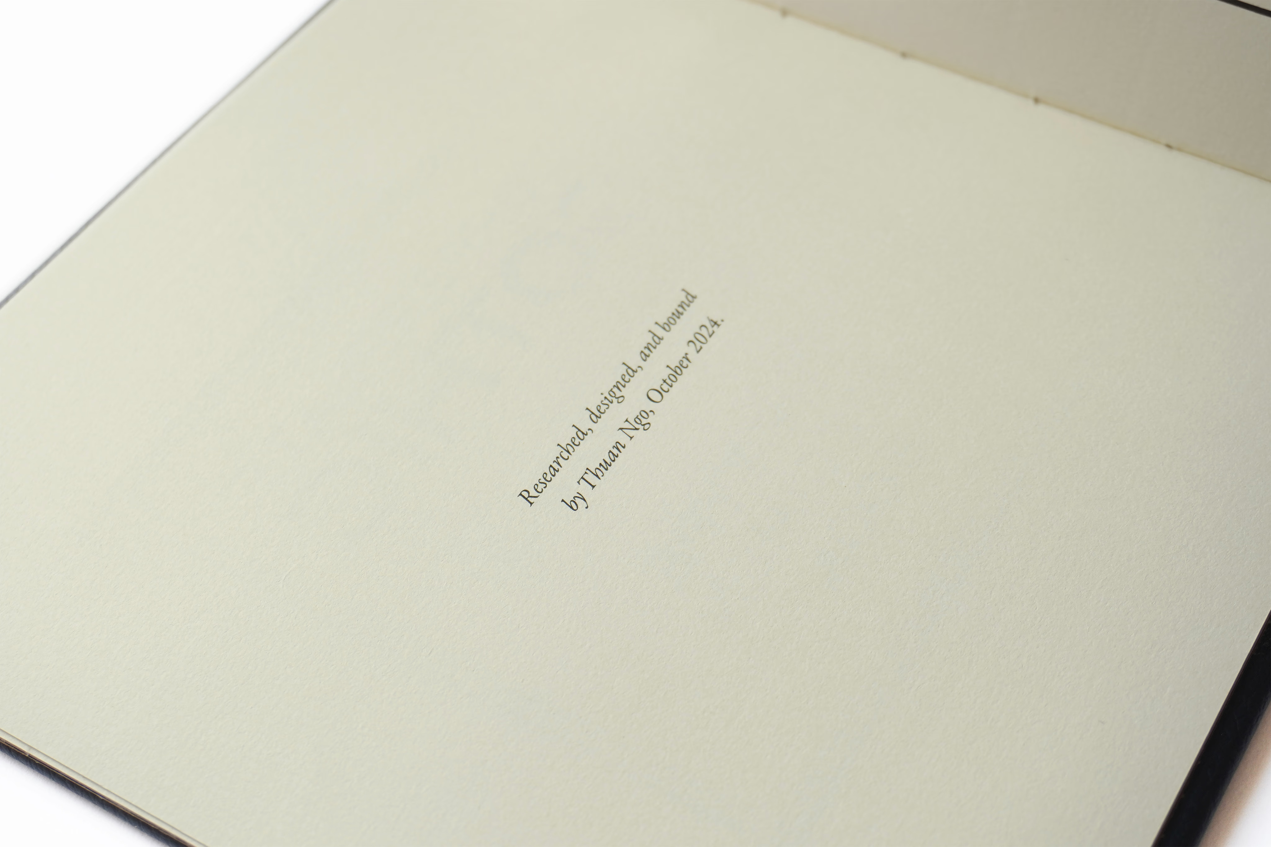 A defining feature of the book is the gold foiling on the cover. Due to the limitations of a student production run, traditional hot stamping was unavailable. I improvised by using a hand-gilding technique with a decal stencil and adhesive. The process was difficult, and the result produced a slightly imperfect, weathered texture to the gold lettering. Rather than a flaw, this “happy accident” enhanced the concept, making the book appear genuinely worn by time and human hands.