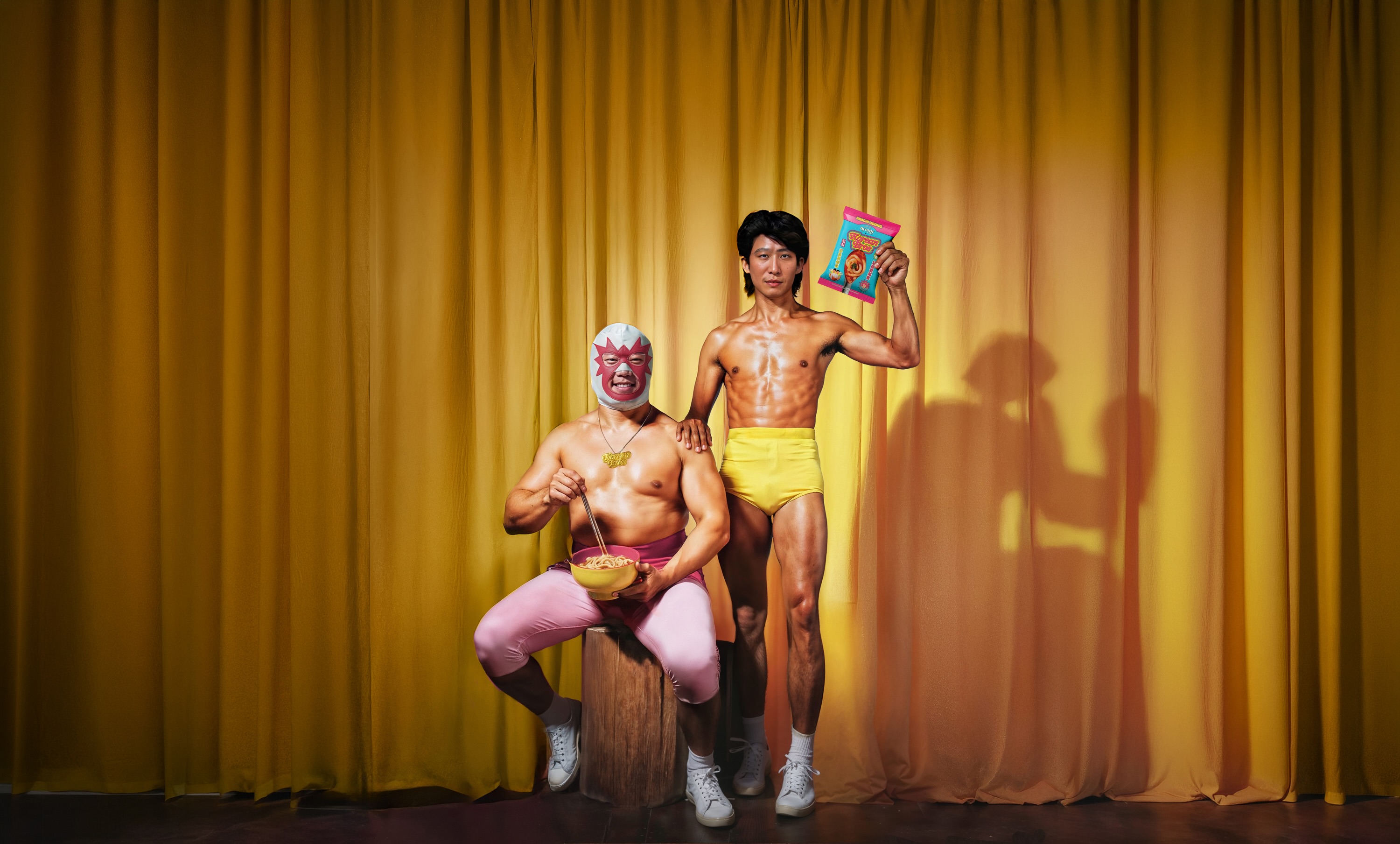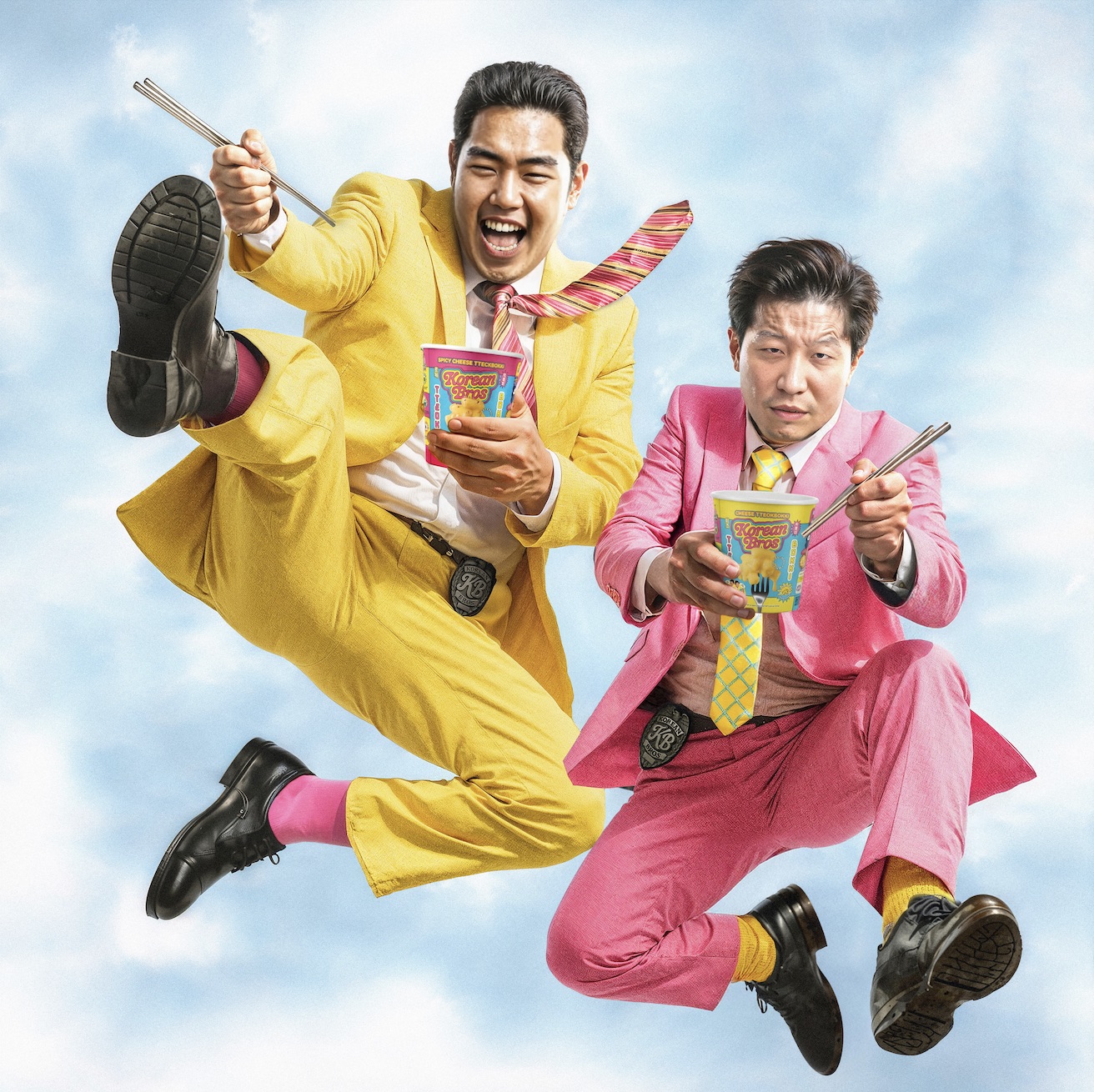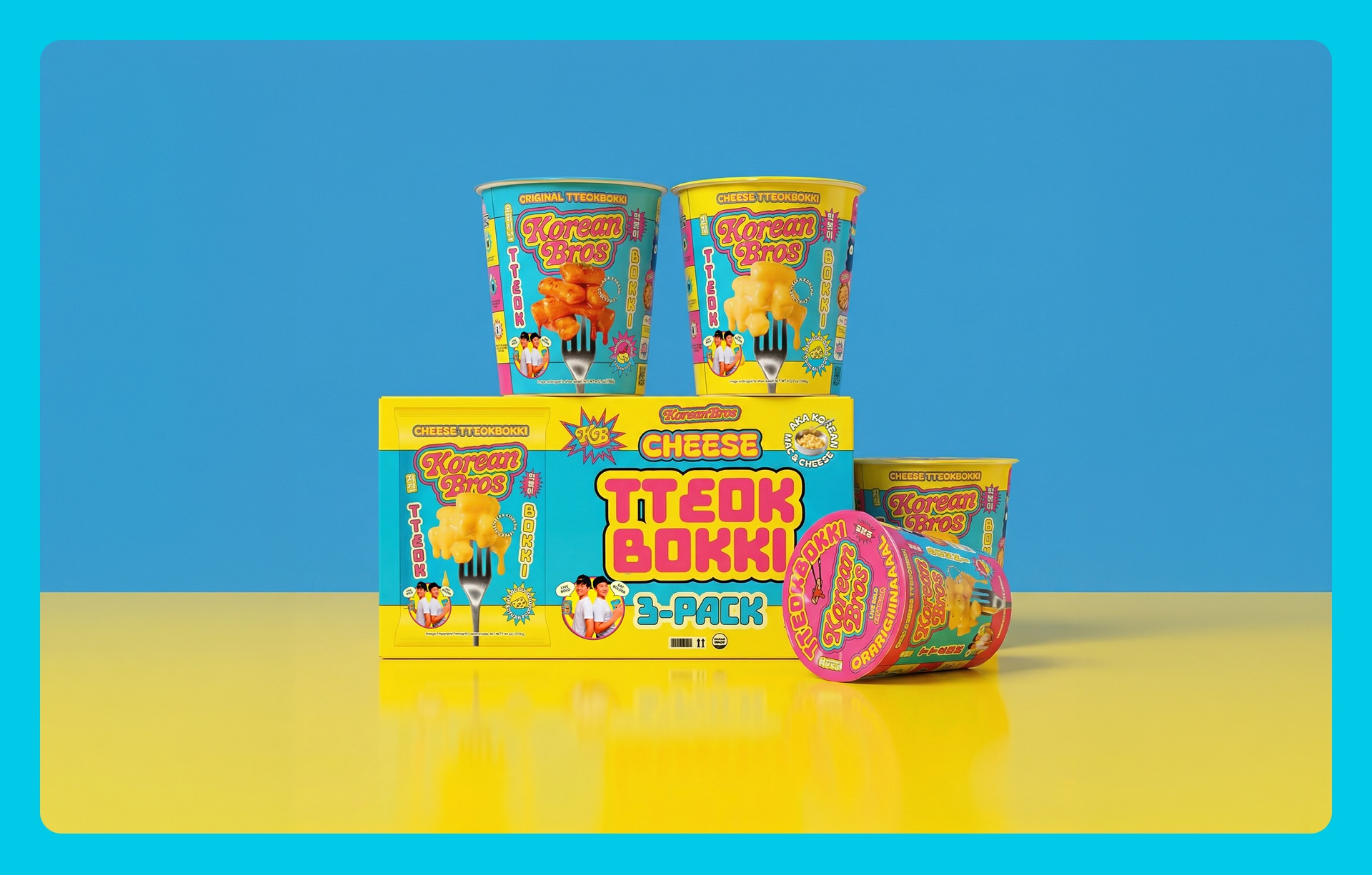 Truffl designed the Korean Bros wordmark as a custom bubble-lettered logotype — thick, inflated, and deliberately cartoonish, reading more like the title card of a Saturday morning cartoon than a food brand. A vivid yellow, hot pink, and electric cyan color palette anchors the system — equal parts comic book and convenience store energy drink, chosen to dominate at shelf against the muted tones and kraft-paper minimalism of the natural food aisle. A hand-drawn illustration library of chopsticks, chili peppers, noodle swirls, dumplings, and flame bursts builds a visual vocabulary that’s instantly recognizable and infinitely extensible. Hangul characters are integrated as graphic elements rather than functional text — communicating heritage without defaulting to tired visual tropes. Meme-style founder photography inspired by Step Brothers, a sticker and badge system, and a bold pattern library ensure Korean Bros owns its visual territory completely.