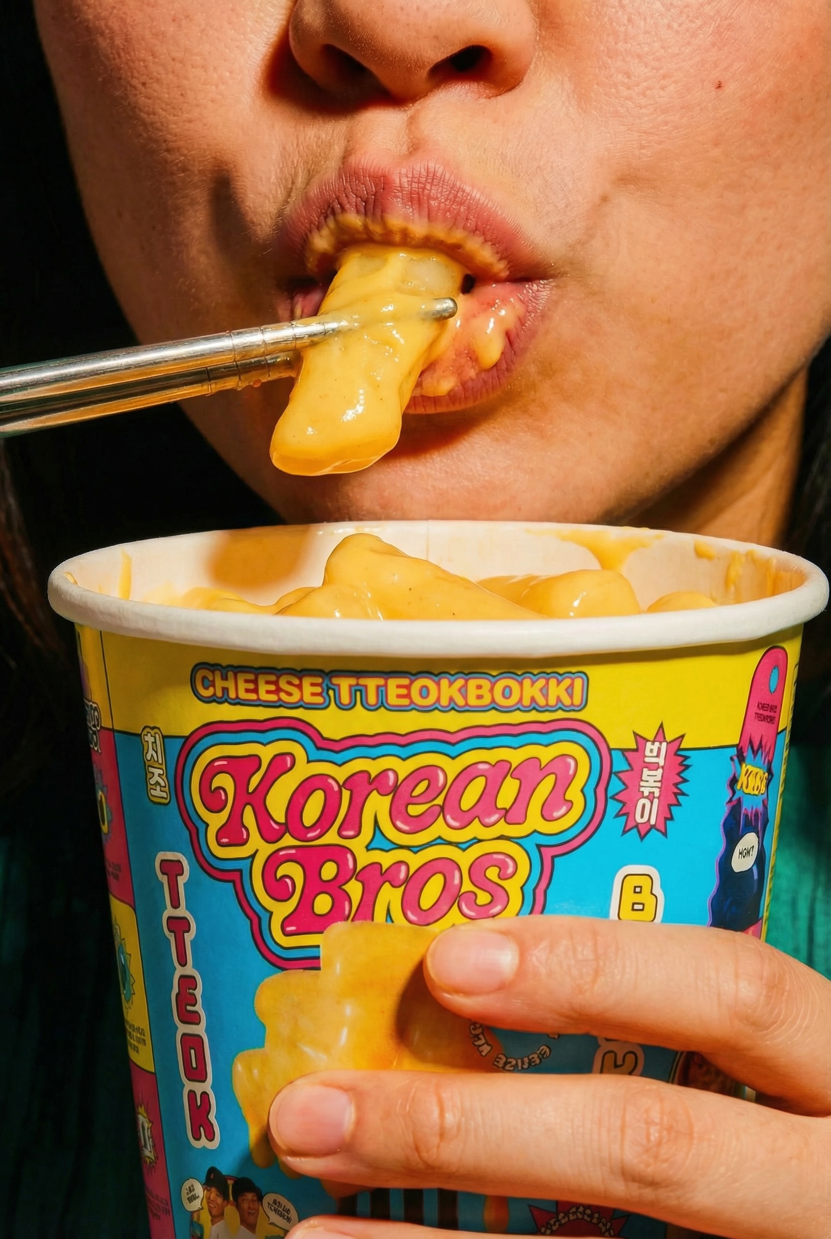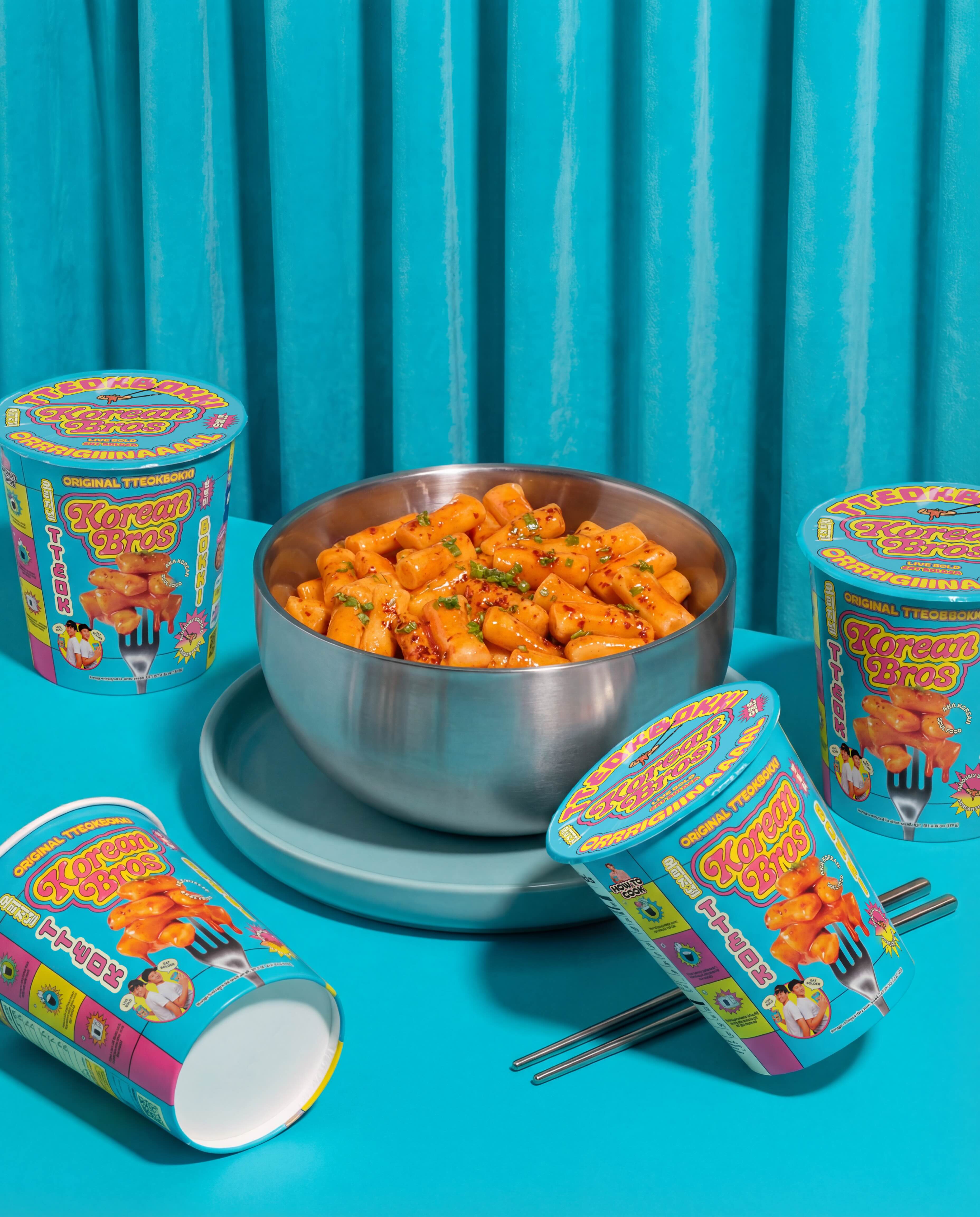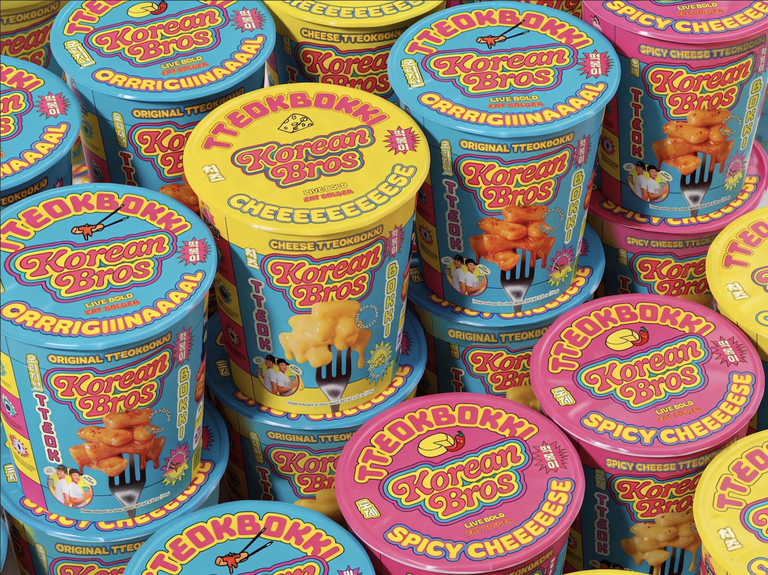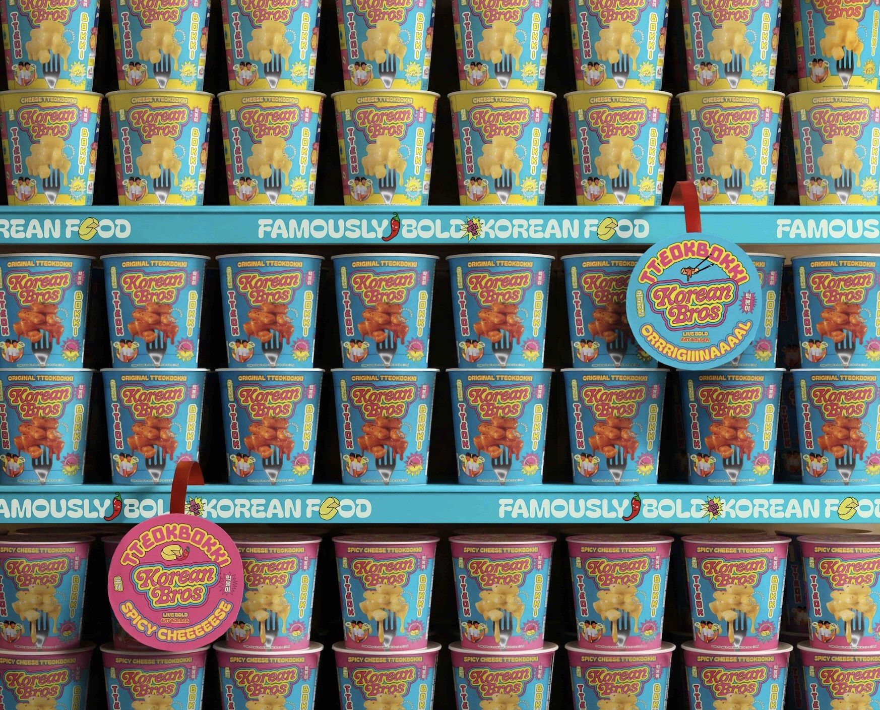The packaging system achieves coherence across the full product range through a consistent visual vocabulary that adapts to each SKU. Dripping food photography communicates flavor. Mascots channel the “Live Bold. Eat Bolder” mantra. Satirical founder photos anchor back-of-pack storytelling. The messaging dials up easy comparisons to American foods — tteokbokki becomes Korean Mac and Cheese — along with comedic flavor profiles and a Bro Origin story on every pack. Korean language translations amp up cultural credibility. Every element, from shelf presence to label detail, reinforces the brand and creates moments of fun and discovery.