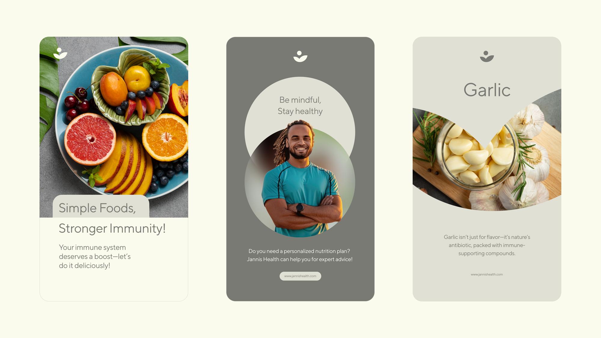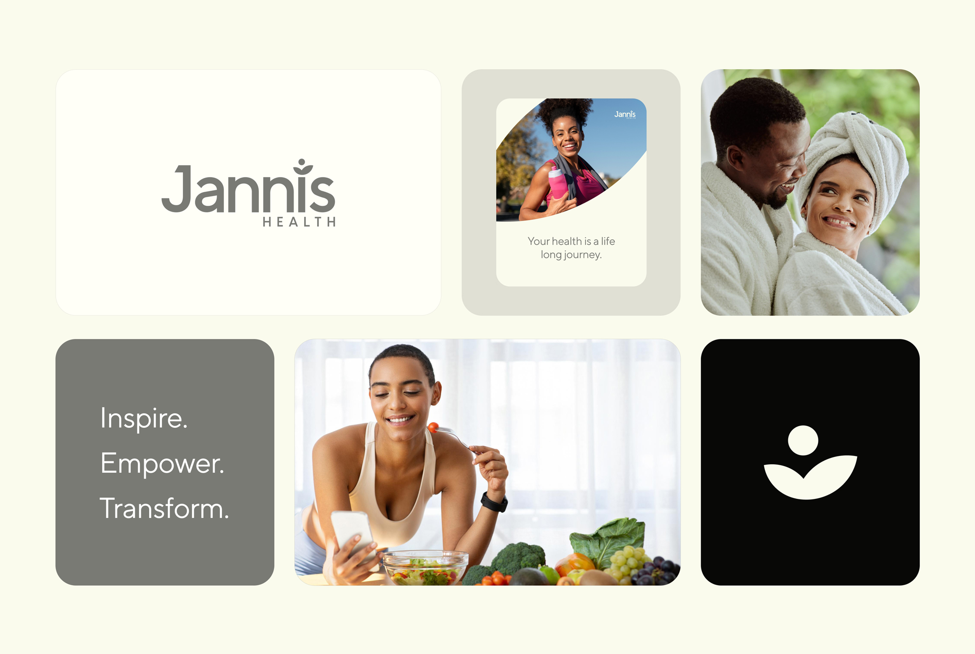 The brand symbol reflects growth, balance, and transformation aligning with Jannis Health’s mission to guide individuals through sustainable wellness journeys. This philosophy extends into the broader system, where modular layouts and flexible design components ensure consistency while allowing for adaptability across digital platforms, social content, and editorial materials.