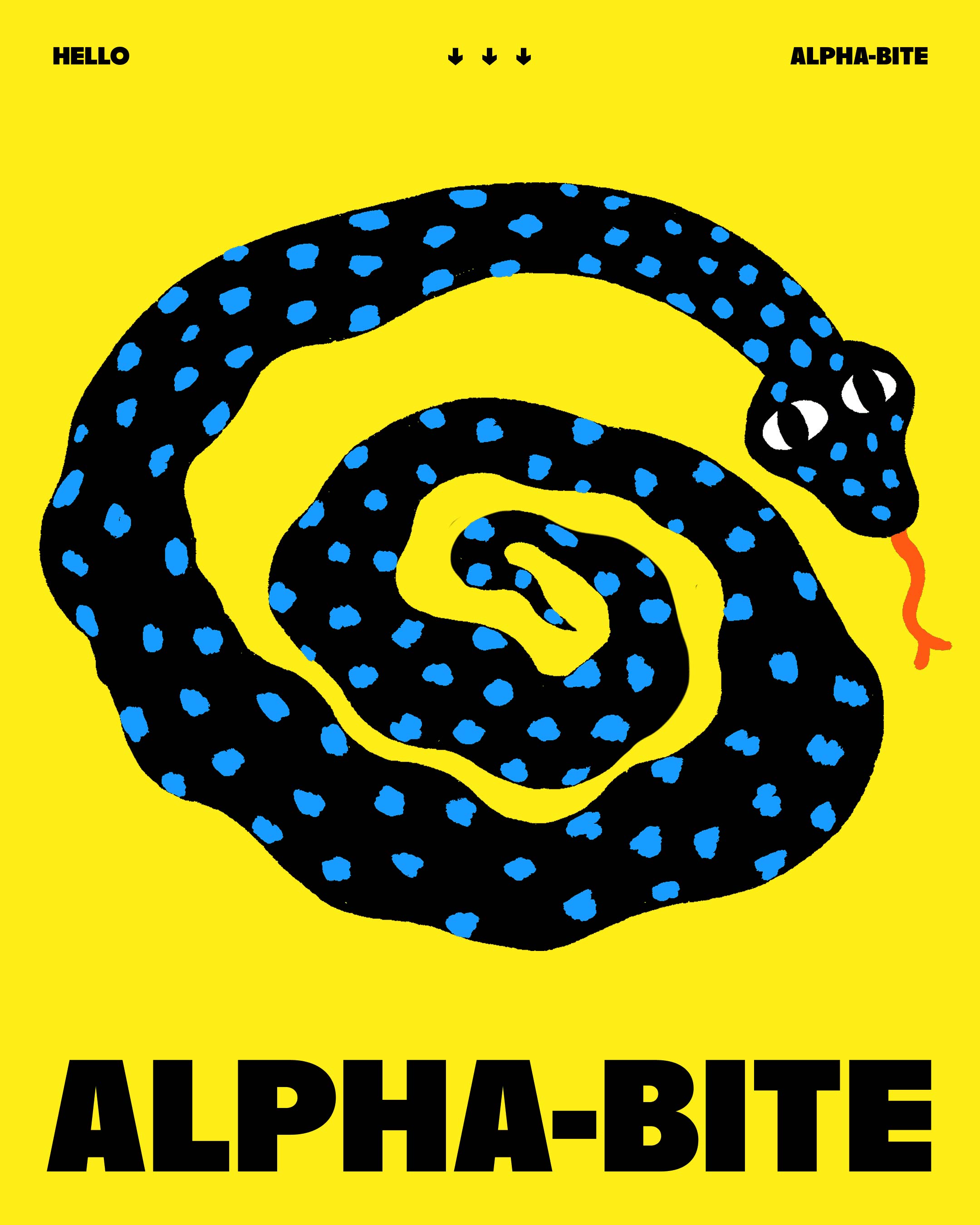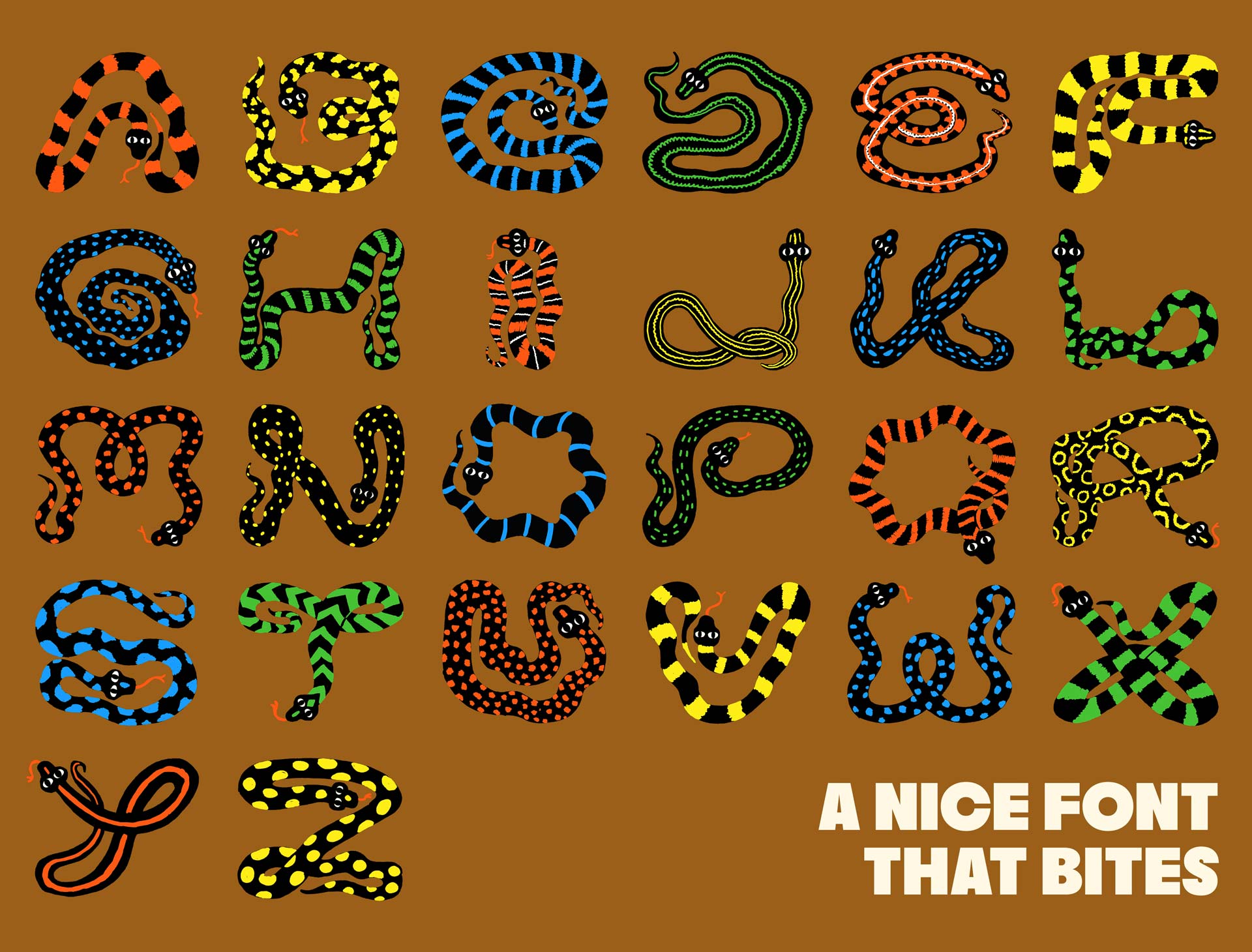 ALPHA-BITE is a whimsical, bold alphabet crafted with a lot of love for nature. It’s designed to spark curiosity, highlight the beauty of snakes, and bring a touch of wild character into the world of custom type.