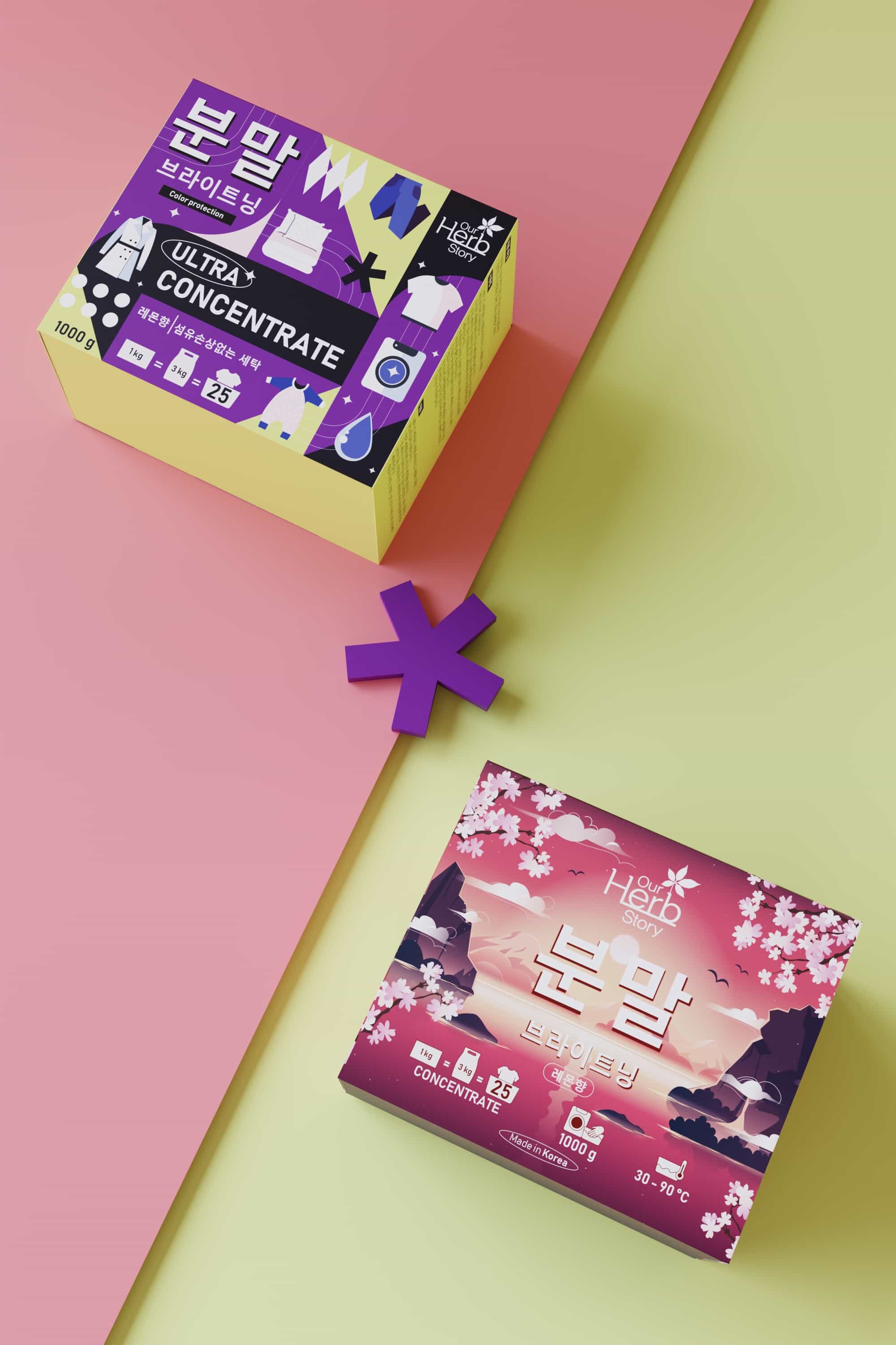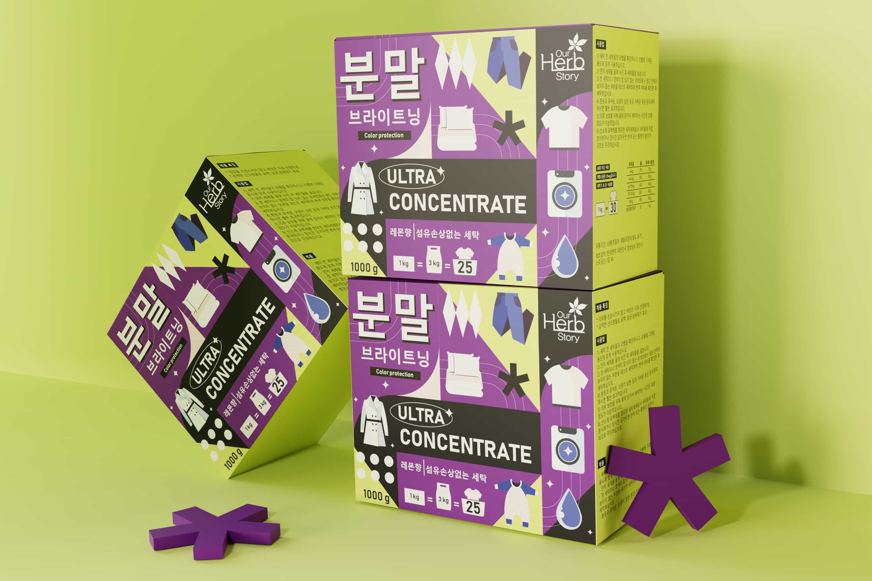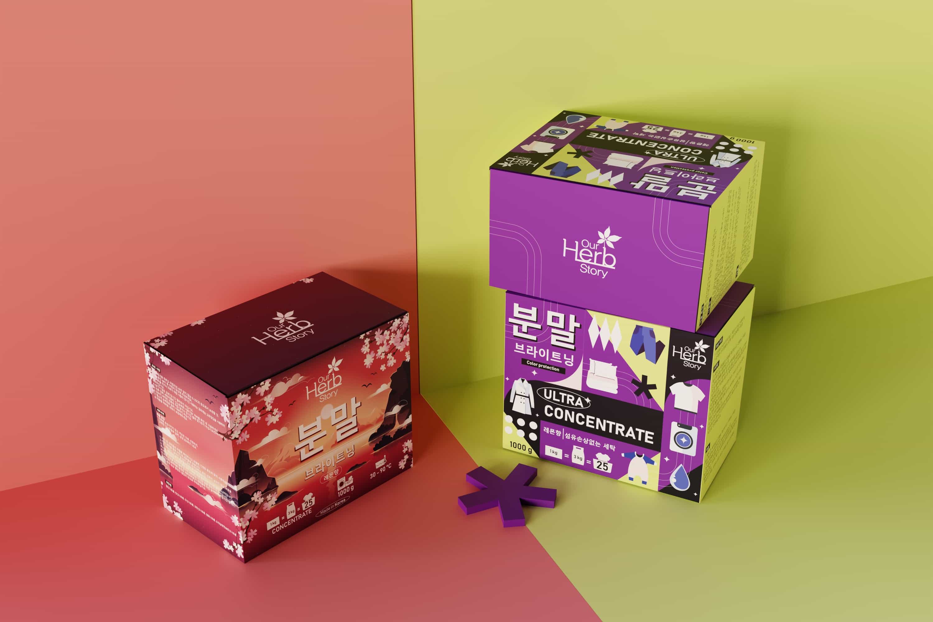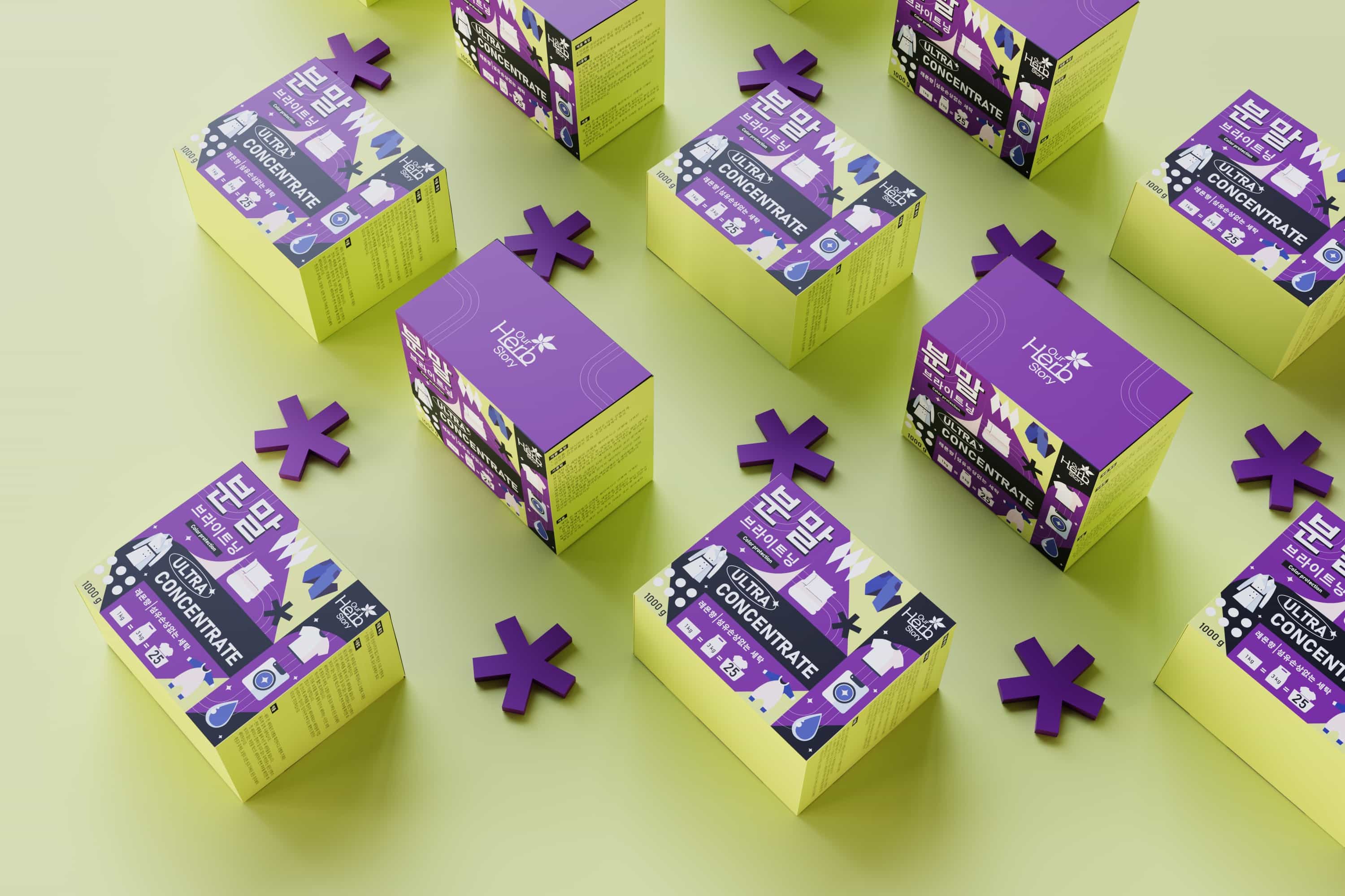 For the Korean laundry detergent brand Our Herb Story, VILKA Agency developed two complementary visual directions that demonstrate how packaging can translate both function and emotion into a coherent on‑shelf language.