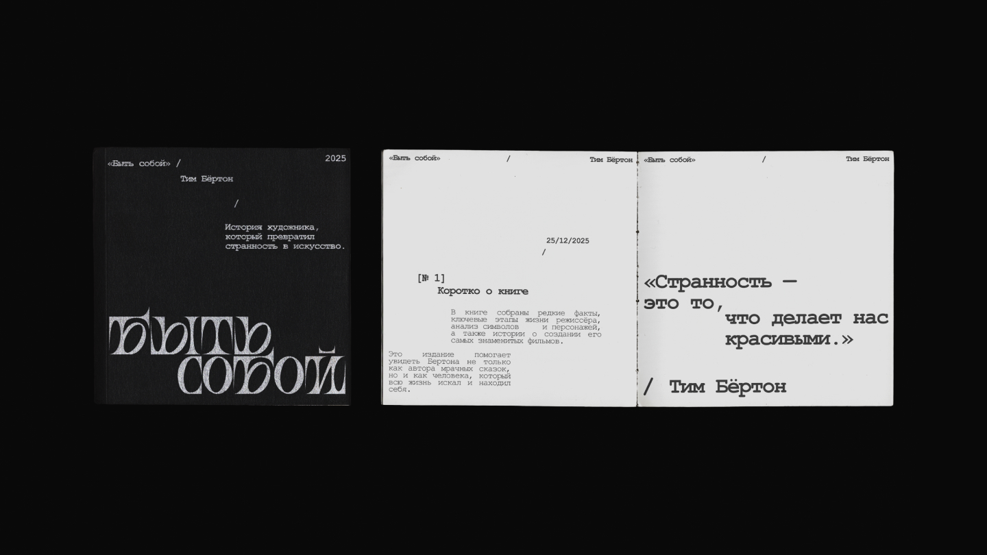 Typography is inspired by the theme of loneliness in Burton’s films: his main characters do not fit into society, they are the only “abnormal” ones among many “normal” people. The serifs of the typeface also break the rules and stand out, echoing the sharp, distinctive features of Burton’s characters.