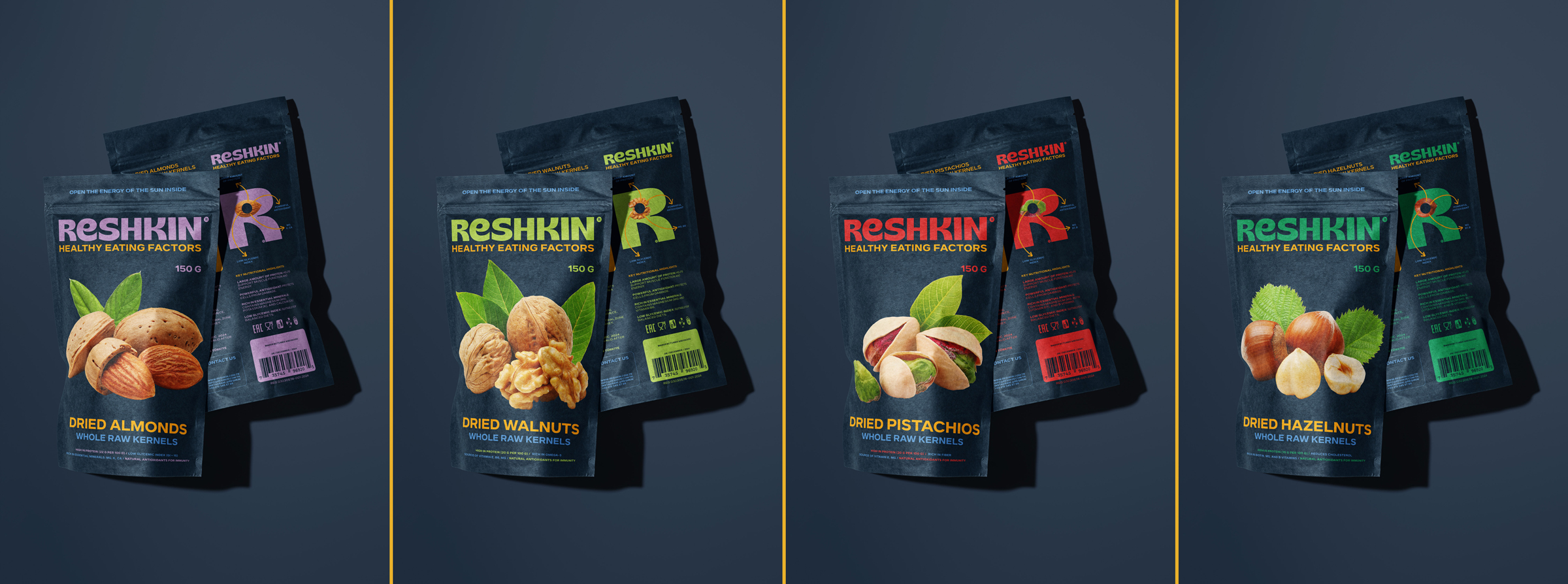 Reshkin is a premium line of natural nuts created for those who value healthy eating and elegant design. The name “Reshkin” resonates with the crunchy sound of nuts and metaphorically conveys the sun’s energy contained in each one, highlighting their natural goodness and rich flavors. The slogans “Healthy Eating Factors,” “Open the Energy of the Sun Inside,” and “Healthy Never Tasted Better” emphasize a wholesome lifestyle and positive energy.