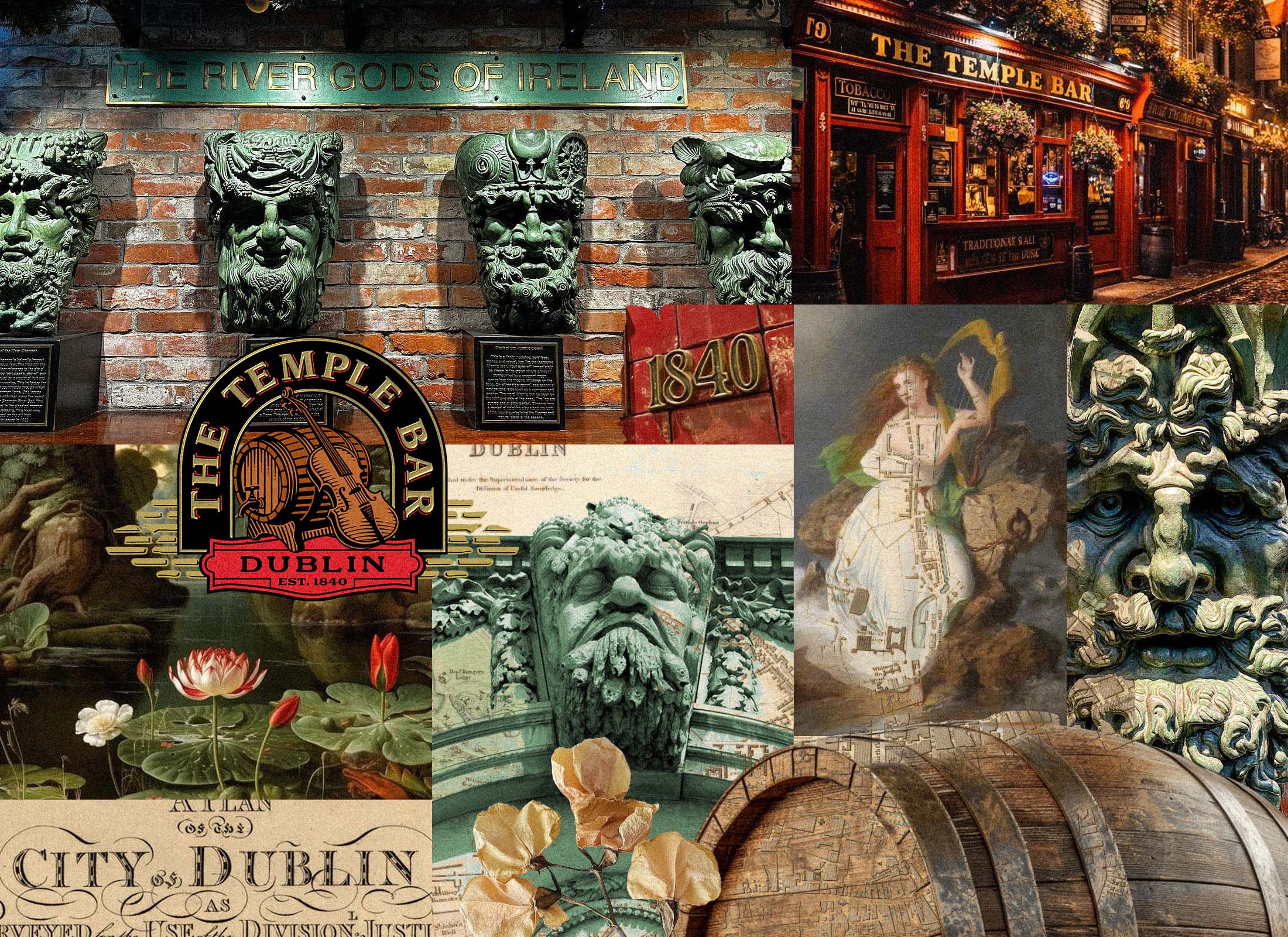 In shaping this vodka’s identity, we explored names, design directions, and motifs that could capture its essence. Ultimately, the clarity and strength of the name “Irish Vodka” felt undeniable. To enrich the story, we turned to the mythic presence of Ireland’s River Gods—guardians of abundance and mystery, flowing through folklore as spirits that shaped the land and nourished its people. Their divine presence, majestic and unpredictable, bound communities to nature’s rhythm. This choice also connects directly to The Temple Bar itself, where a proud collection of River God statues stands in the beer garden, echoing the mythology in a tangible way.